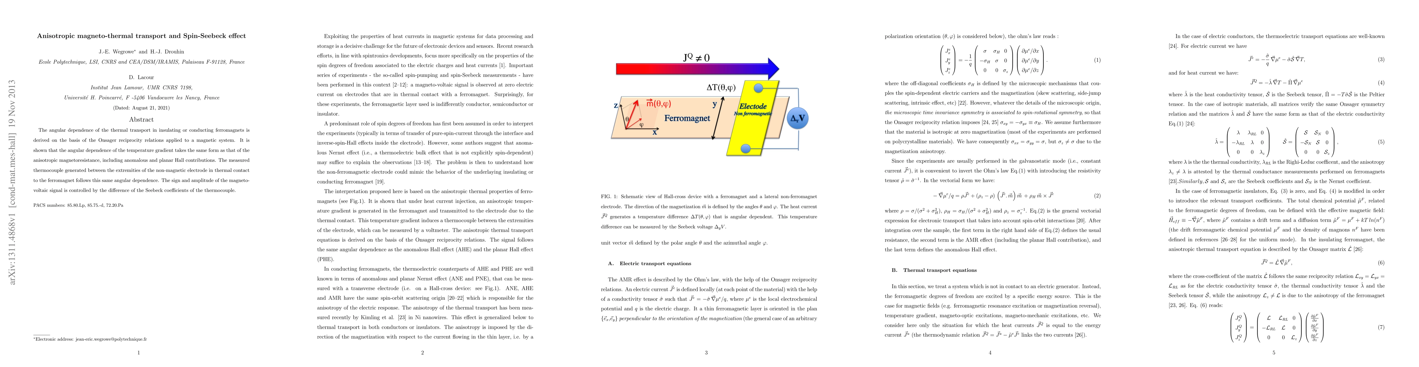 This study derives the angular dependence of thermal transport in ferromagnetic materials using Onsager reciprocity relations, revealing a correlation with anisotropic magnetoresistance. The Spin-Seebeck effect's thermocouple signal in non-magnetic electrodes in contact with ferromagnets also exhibits this angular dependence, with its magnitude and sign determined by the difference in Seebeck coefficients.