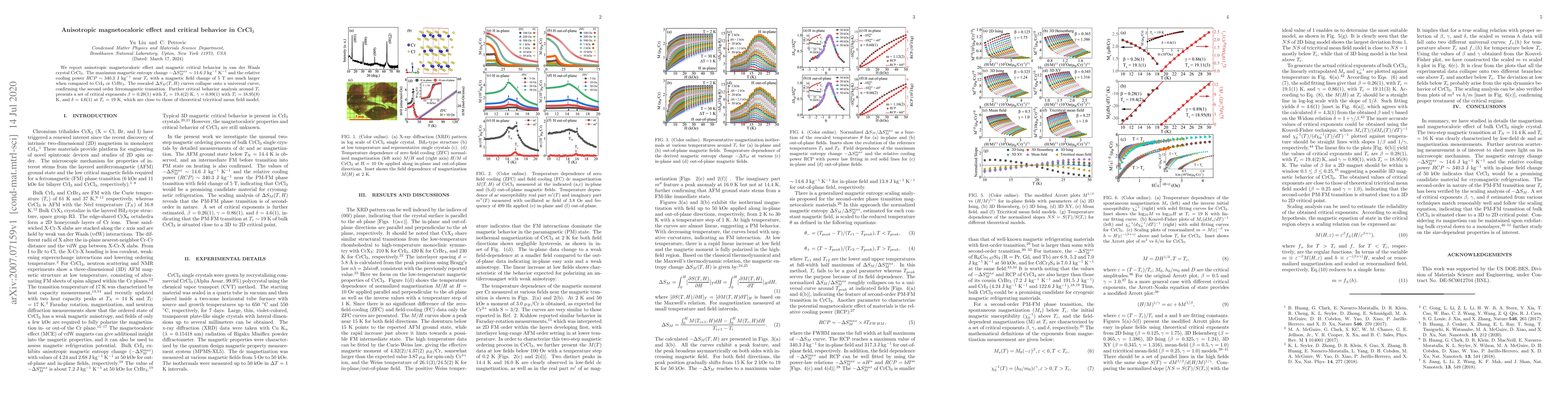 We report anisotropic magnetocaloric effect and magnetic critical behavior in van der Waals crystal CrCl$_3$. The maximum magnetic entropy change $-\Delta S_M^{max} \sim 14.6$ J kg$^{-1}$ K$^{-1}$ and the relative cooling power $RCP \sim 340.3$ J kg$^{-1}$ near $T_c$ with a magnetic field change of 5 T are much larger when compared to CrI$_{3}$ or CrBr$_{3}$. The rescaled $\Delta S_M(T,H)$ curves collapse onto a universal curve, confirming the second order ferromagnetic transition. Further critical behavior analysis around $T_c$ presents a set of critical exponents $\beta$ = 0.28(1) with $T_c$ = 19.4(2) K, $\gamma$ = 0.89(1) with $T_c$ = 18.95(8) K, and $\delta$ = 4.6(1) at $T_c$ = 19 K, which are close to those of theoretical tricritical mean field model.