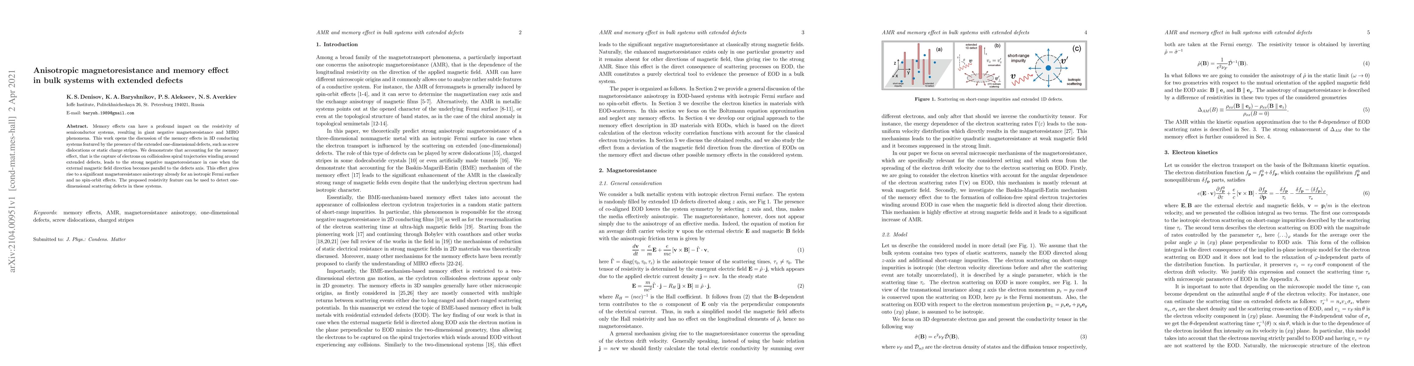 Memory effects can have a profound impact on the resistivity of semiconductor systems, resulting in giant negative magnetoresistance and MIRO phenomena. This work opens the discussion of the memory effects in 3D conducting systems featured by the presence of the extended one-dimensional defects, such as screw dislocations or static charge stripes. We demonstrate that accounting for the memory effect, that is the capture of electrons on collisionless spiral trajectories winding around extended defects, leads to the strong negative magnetoresistance in case when the external magnetic field direction becomes parallel to the defects axis. This effect gives rise to a significant magnetoresistance anisotropy already for an isotropic Fermi surface and no spin-orbit effects. The proposed resistivity feature can be used to detect one-dimensional scattering defects in these systems.