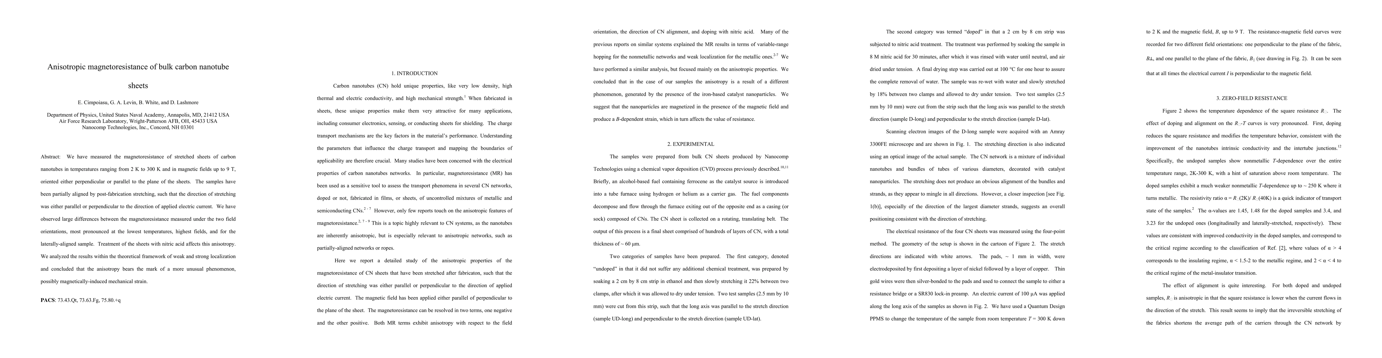 We have measured the magnetoresistance of stretched sheets of carbon nanotubes in temperatures ranging from 2 K to 300 K and in magnetic fields up to 9 T, oriented either perpendicular or parallel to the plane of the sheets. The samples have been partially aligned by post-fabrication stretching, such that the direction of stretching was either parallel or perpendicular to the direction of applied electric current. We have observed large differences between the magnetoresistance measured under the two field orientations, most pronounced at the lowest temperatures, highest fields, and for the laterally-aligned sample. Treatment of the sheets with nitric acid affects this anisotropy. We analyzed the results within the theoretical framework of weak and strong localization and concluded that the anisotropy bears the mark of a more unusual phenomenon, possibly magnetically-induced mechanical strain.
