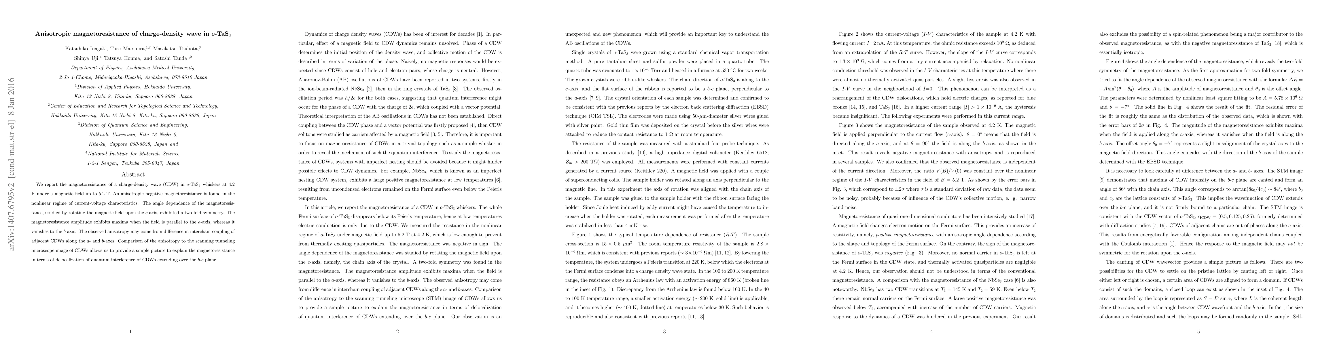 We report the magnetoresistance of a charge-density wave (CDW) in $o$-TaS$_3$ whiskers at 4.2 K under a magnetic field up to 5.2 T. An anisotropic negative magnetoresistance is found in the nonlinear regime of current-voltage characteristics. The angle dependence of the magnetoresistance, studied by rotating the magnetic field upon the $c$-axis, exhibited a two-fold symmetry. The magnetoresistance amplitude exhibits maxima when the field is parallel to the $a$-axis, whereas it vanishes to the $b$-axis. The observed anisotropy may come from difference in interchain coupling of adjacent CDWs along the $a$- and $b$-axes. Comparison of the anisotropy to the scanning tunneling microscope image of CDWs allows us to provide a simple picture to explain the magnetoresistance in terms of delocalization of quantum interference of CDWs extending over the $b$-$c$ plane.