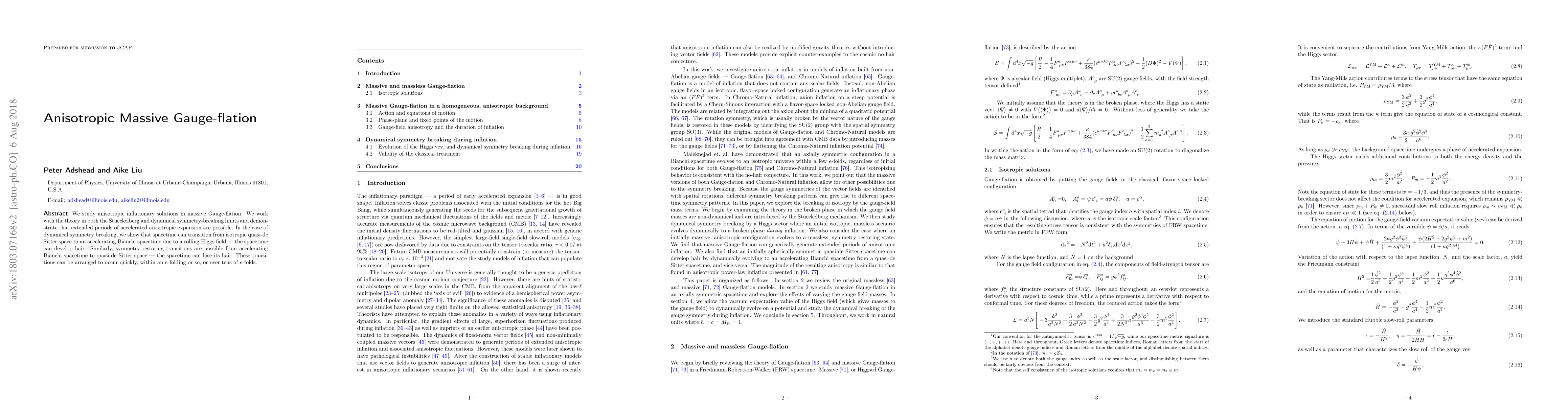 This paper explores anisotropic inflationary solutions in massive Gauge-flation, demonstrating extended periods of accelerated anisotropic expansion. It shows that spacetime can transition from isotropic quasi-de Sitter to accelerating Bianchi spacetime due to a rolling Higgs field, and vice versa, with these transitions occurring rapidly or over extended periods.