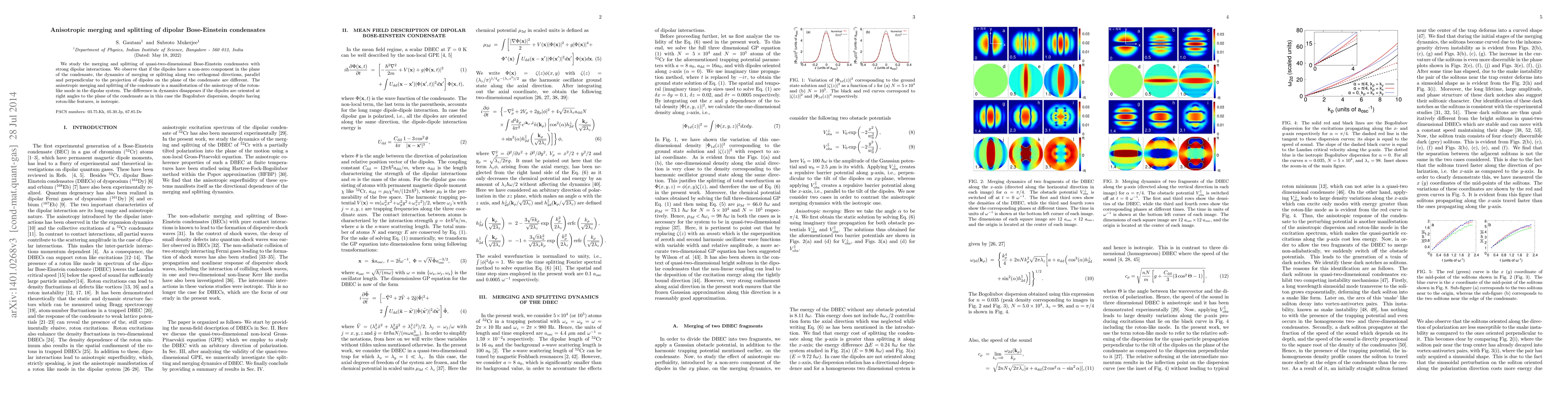 We study the merging and splitting of quasi-two-dimensional Bose-Einstein condensates with strong dipolar interactions. We observe that if the dipoles have a non-zero component in the plane of the condensate, the dynamics of merging or splitting along two orthogonal directions, parallel and perpendicular to the projection of dipoles on the plane of the condensate are different. The anisotropic merging and splitting of the condensate is a manifestation of the anisotropy of the roton-like mode in the dipolar system. The difference in dynamics disappears if the dipoles are oriented at right angles to the plane of the condensate as in this case the Bogoliubov dispersion, despite having roton-like features, is isotropic.