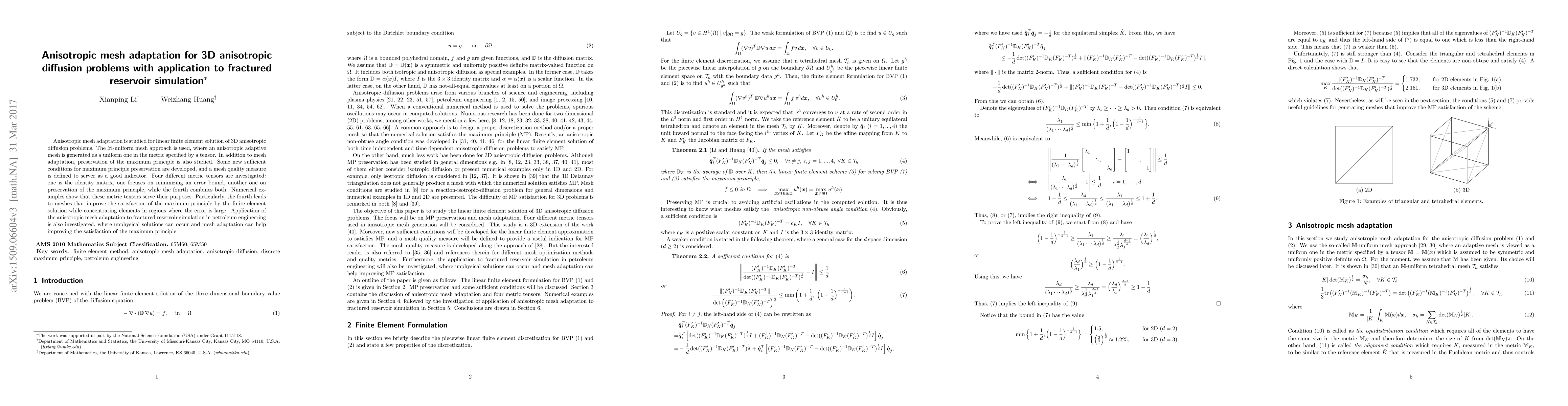 This paper studies anisotropic mesh adaptation for solving 3D anisotropic diffusion problems using the M-uniform mesh approach, focusing on preserving the maximum principle. Various metric tensors are explored, and numerical results demonstrate improved finite element solutions, particularly in fractured reservoir simulations.