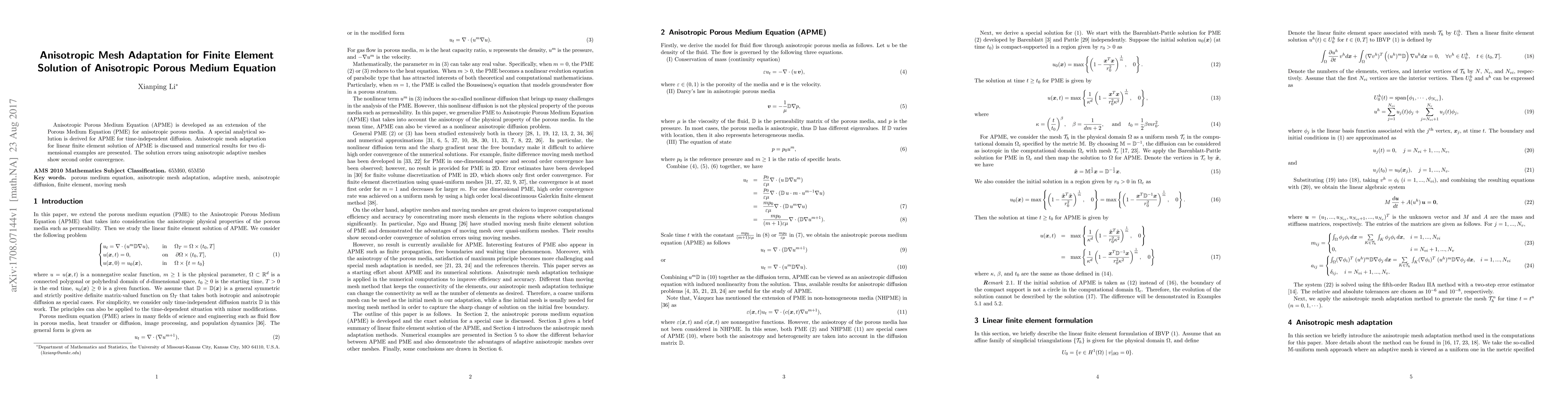 This paper develops the Anisotropic Porous Medium Equation (APME) for anisotropic porous media and presents an analytical solution for time-independent diffusion. It discusses anisotropic mesh adaptation for linear finite element solutions of APME, demonstrating second-order convergence in numerical results for two-dimensional examples.