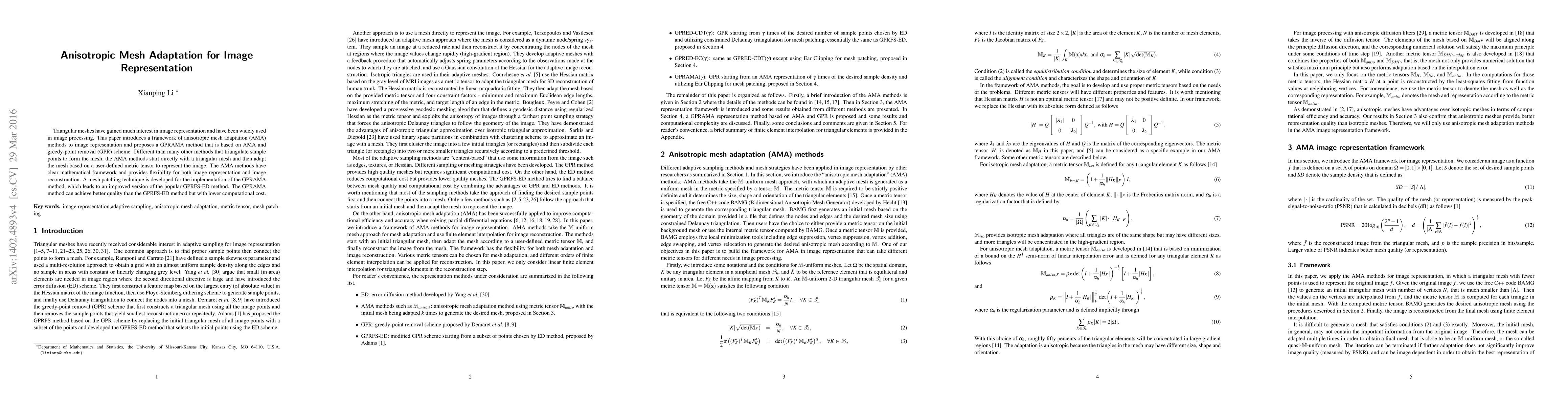 This paper presents anisotropic mesh adaptation (AMA) methods for image representation, introducing a GPRAMA method based on AMA and a greedy-point removal scheme. Unlike traditional triangulation methods, AMA starts with a triangular mesh and adapts it using a metric tensor, offering flexibility and improved image reconstruction. The GPRAMA method enhances the GPRFS-ED method with mesh patching, achieving better quality at lower computational costs.