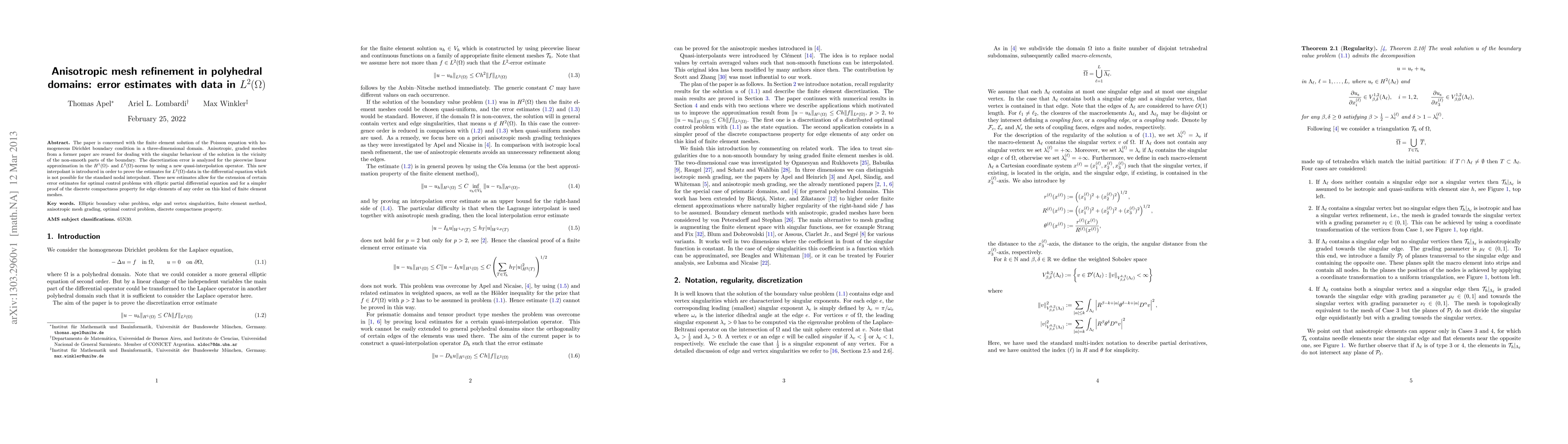 The paper investigates anisotropic mesh refinement for solving the Poisson equation in polyhedral domains, focusing on the discretization error analysis using a new quasi-interpolation operator. This method allows for improved error estimates in L^2(\Omega) for non-smooth boundary conditions, extending results to optimal control problems and simplifying proofs of discrete compactness.