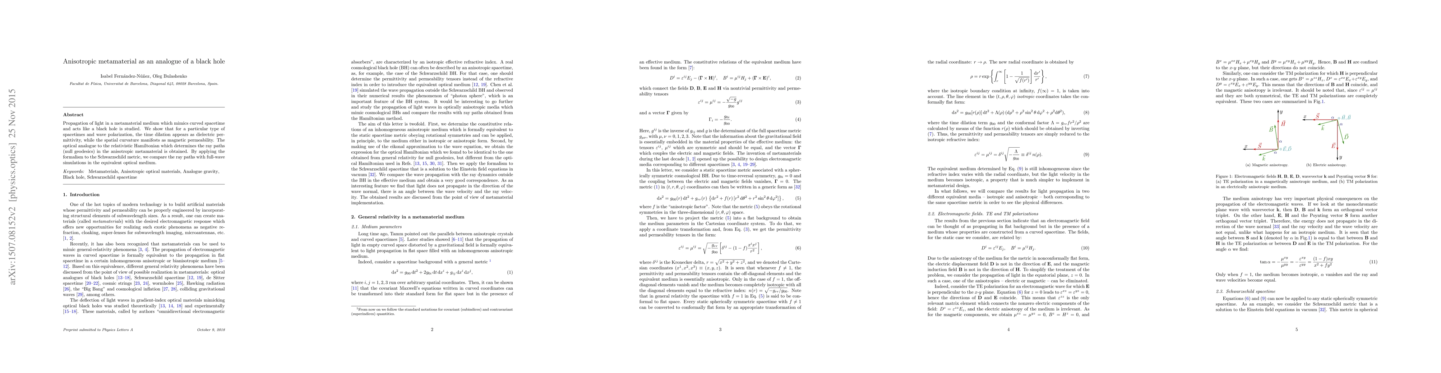 This paper investigates how anisotropic metamaterials can mimic the curved spacetime of a black hole, demonstrating that time dilation and spatial curvature can be represented by dielectric and magnetic properties, respectively. Full-wave simulations confirm the optical analogue of relativistic Hamiltonian and null geodesics in the metamaterial.