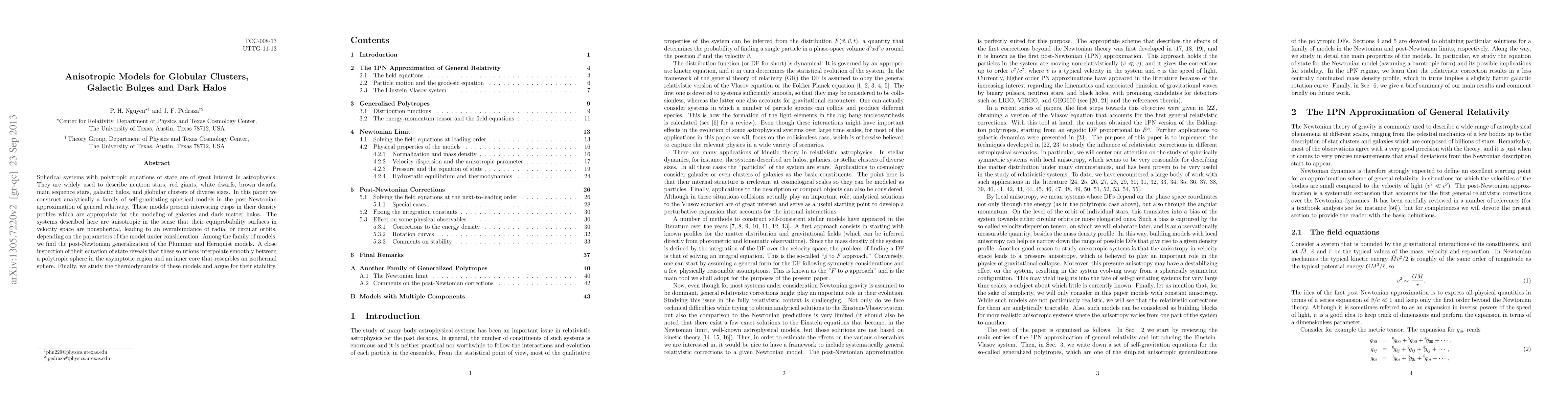 This paper constructs anisotropic self-gravitating spherical models in post-Newtonian relativity, finding cusps in density profiles suitable for galactic and dark matter halo modeling. The models interpolate between polytropic and isothermal spheres, and their stability is argued through thermodynamic analysis.