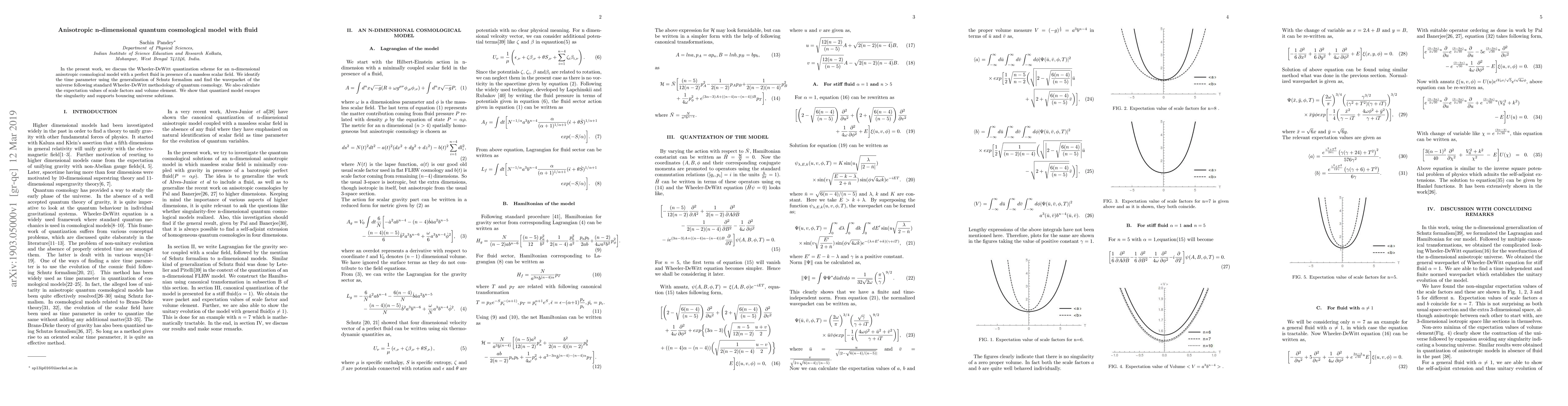 This paper explores the Wheeler-DeWitt quantization of an n-dimensional anisotropic cosmological model with a perfect fluid and a massless scalar field, demonstrating that the model avoids singularities and supports bouncing universe solutions. The study uses the generalized Schutz formalism to identify the time parameter and calculates expectation values of scale factors and volume.
