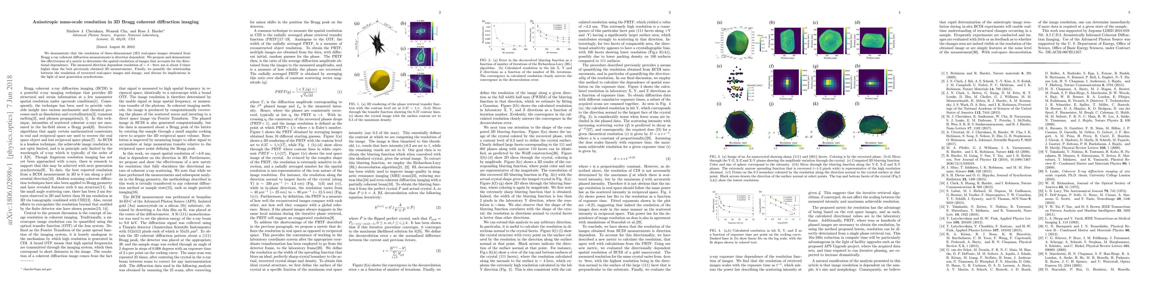 This paper demonstrates anisotropic nano-scale resolution in 3D Bragg coherent diffraction imaging, showing that resolution varies with direction and proposes a metric to account for this. The achieved directional resolution of ~4-9nm is twice as high as previous 3D measurements, and it discusses the impact of dosage on image resolution.
