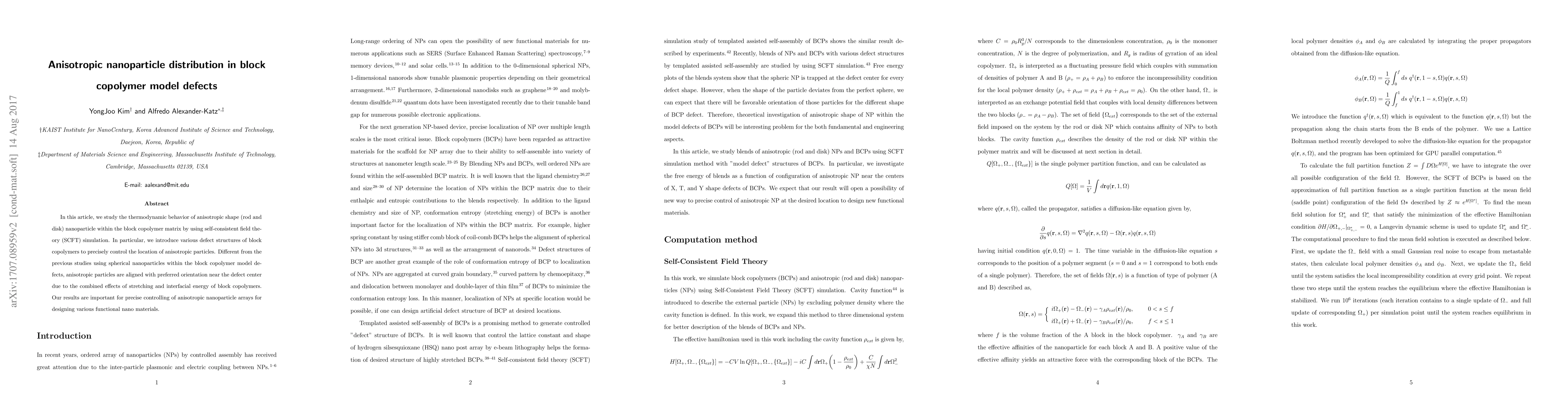 In this article, we study the thermodynamic behavior of anisotropic shape (rod and disk) nanoparticle within the block copolymer matrix by using self-consistent field theory (SCFT) simulation. In particular, we introduce various defect structures of block copolymers to precisely control the location of anisotropic particles. Different from the previous studies using spherical nanoparticles within the block copolymer model defects, anisotropic particles are aligned with preferred orientation near the defect center due to the combined effects of stretching and interfacial energy of block copolymers. Our results are important for precise controlling of anisotropic nanoparticle arrays for designing various functional nano materials.