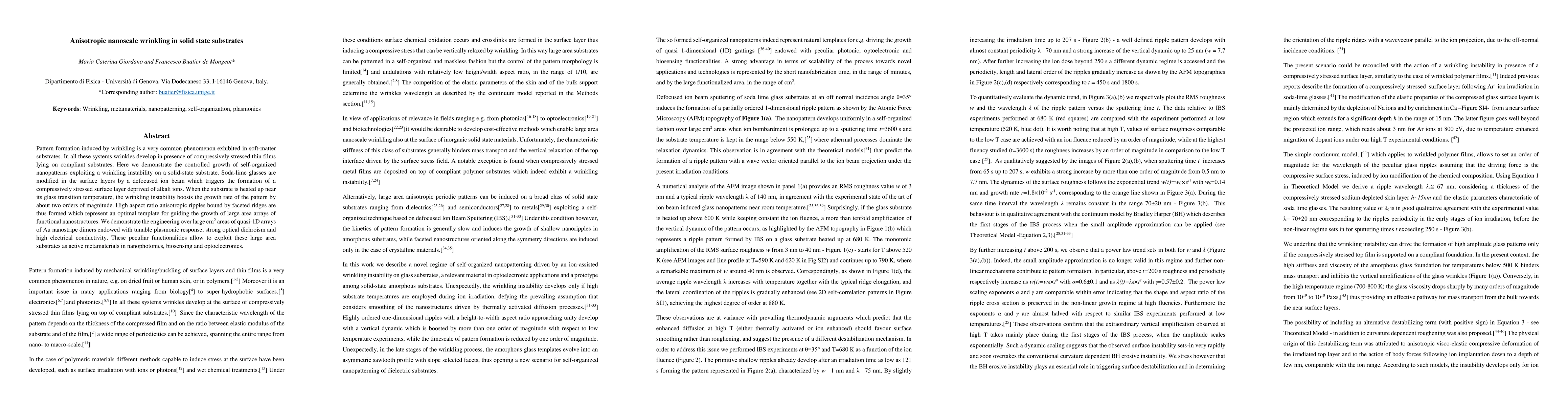 Researchers developed a method to create large-area anisotropic nanostructures on solid-state substrates through controlled wrinkling instability, enabling the growth of functional arrays with tunable plasmonic response and high electrical conductivity.