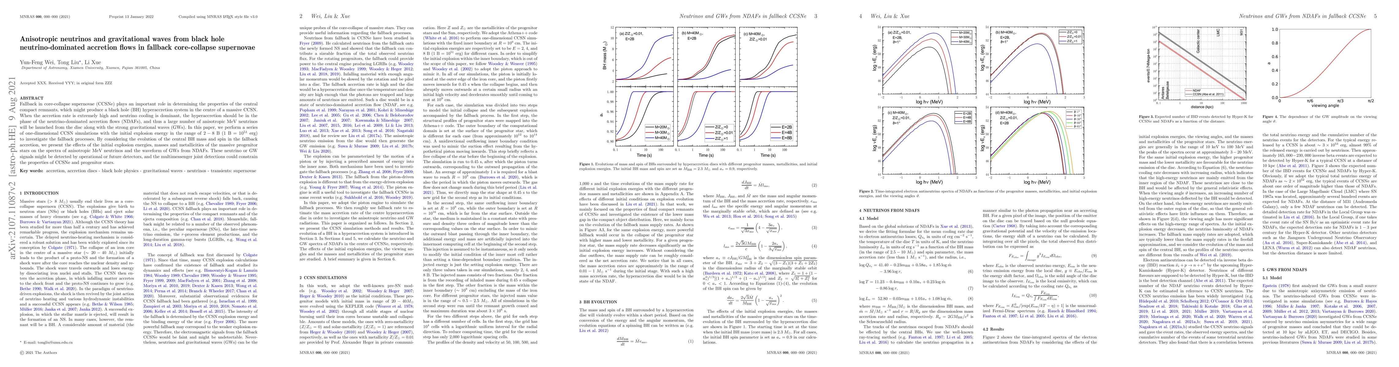 This paper investigates the fallback processes in core-collapse supernovae leading to black hole hyperaccretion systems, focusing on neutrino-dominated accretion flows. It explores the impact of initial explosion energies, stellar masses, and metallicities on the spectra of anisotropic neutrinos and the waveforms of gravitational waves, potentially detectable by current and future observatories.