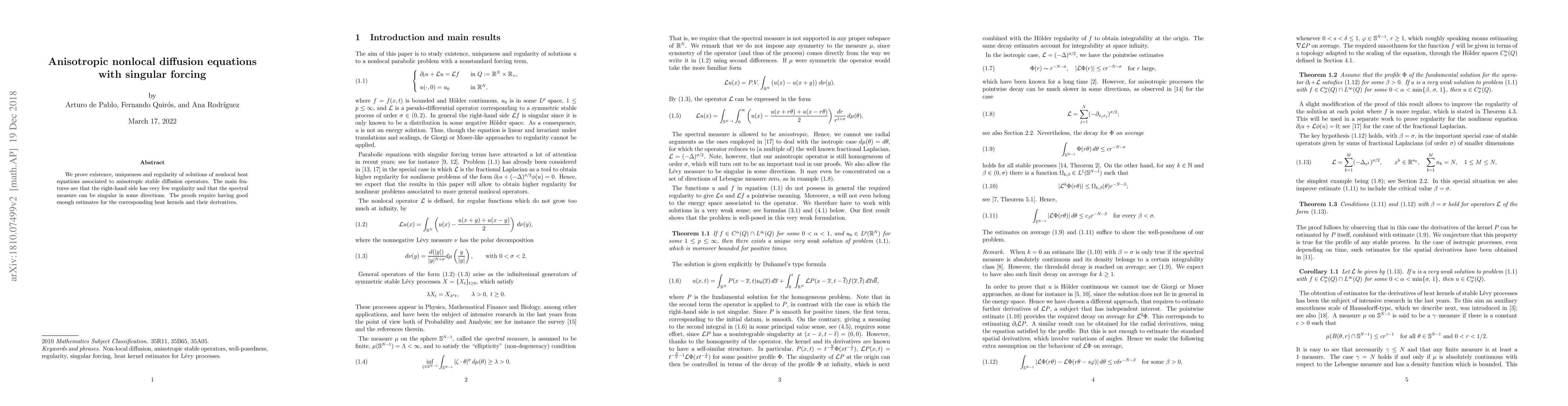 We prove existence, uniqueness and regularity of solutions of nonlocal heat equations associated to anisotropic stable diffusion operators. The main features are that the right-hand side has very few regularity and that the spectral measure can be singular in some directions. The proofs require having good enough estimates for the corresponding heat kernels and their derivatives.