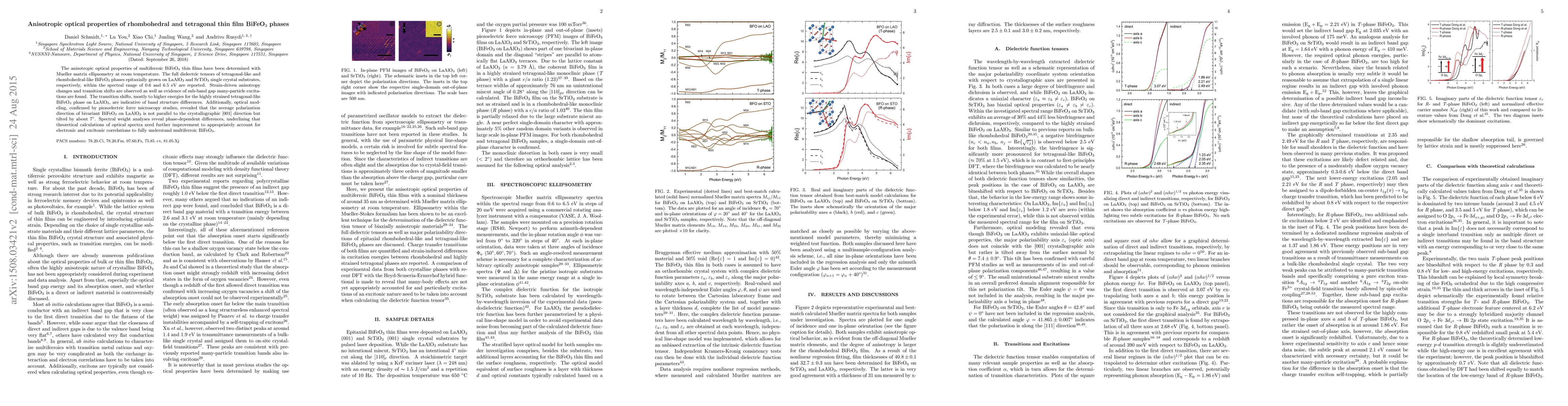 The anisotropic optical properties of multiferroic BiFeO$_3$ thin films have been determined with Mueller matrix ellipsometry at room-temperature. The full dielectric tensors of tetragonal-like and rhombohedral-like BiFeO$_3$ phases epitaxially grown on LaAlO$_3$ and SrTiO$_3$ single crystal substrates, respectively, within the spectral range of 0.6 and 6.5 eV are reported. Strain-driven anisotropy changes and transition shifts are observed as well as evidence of sub-band gap many-particle excitations are found. The transition shifts, mostly to higher energies for the highly strained tetragonal-like BiFeO$_3$ phase on LaAlO$_3$, are indicative of band structure differences. Additionally, optical modelling, confirmed by piezoelectric force microscopy studies, revealed that the average polarization direction of bivariant BiFeO$_3$ on LaAlO$_3$ is not parallel to the crystallographic [001] direction but tilted by about $7^{\circ}$. Spectral weight analyses reveal phase-dependent differences underlining that theoretical calculations of optical spectra need further improvement to appropriately account for electronic and excitonic correlations to fully understand multiferroic BiFeO$_3$.