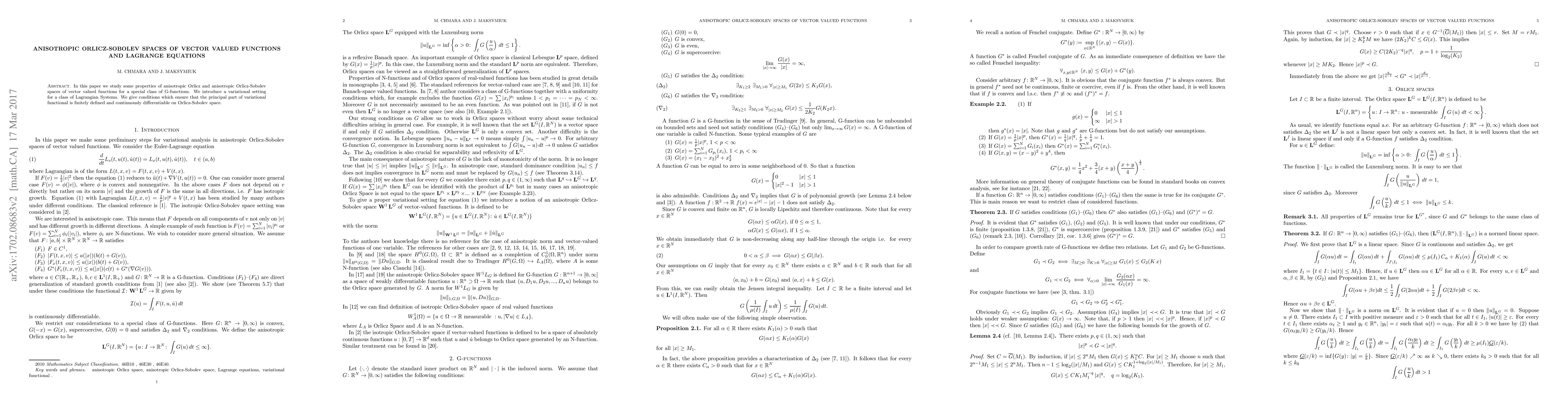 This paper explores anisotropic Orlicz and Orlicz-Sobolev spaces for vector valued functions, focusing on a special class of G-functions. It introduces a variational framework for Lagrangian systems and provides conditions for the variational functional's finite definition and continuous differentiability within these spaces.
