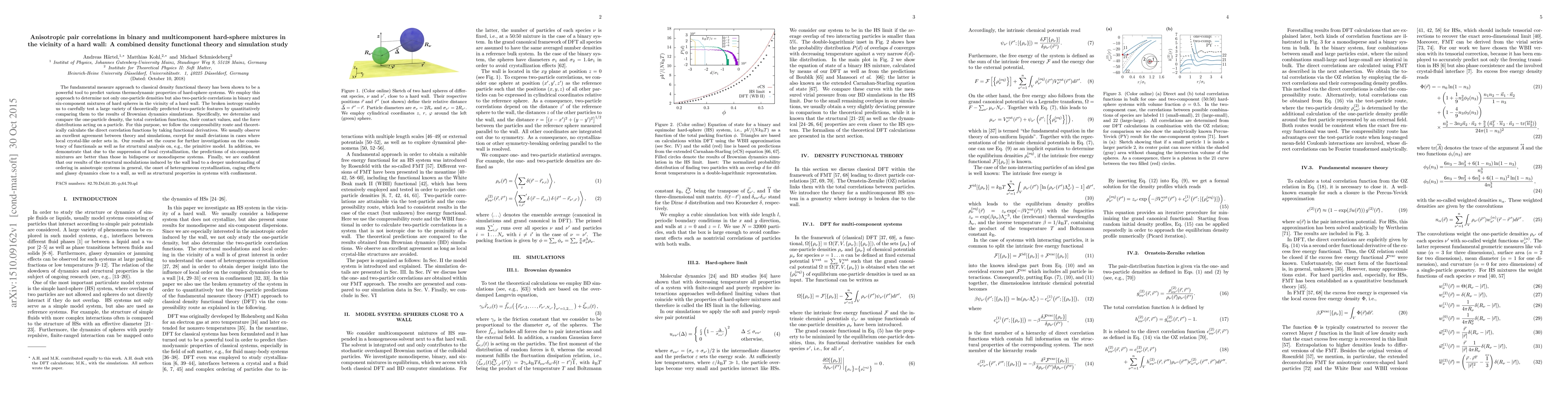 The fundamental measure approach to classical density functional theory has been shown to be a powerful tool to predict various thermodynamic properties of hard-sphere systems. We employ this approach to determine not only one-particle densities but also two-particle correlations in binary and six-component mixtures of hard spheres in the vicinity of a hard wall. The broken isotropy enables us to carefully test a large variety of theoretically predicted two-particle features by quantitatively comparing them to the results of Brownian dynamics simulations. Specifically, we determine and compare the one-particle density, the total correlation functions, their contact values, and the force distributions acting on a particle. For this purpose, we follow the compressibility route and theoretically calculate the direct correlation functions by taking functional derivatives. We usually observe an excellent agreement between theory and simulations, except for small deviations in cases where local crystal-like order sets in. Our results set the course for further investigations on the consistency of functionals as well as for structural analysis on, e.g., the primitive model. In addition, we demonstrate that due to the suppression of local crystallization, the predictions of six-component mixtures are better than those in bidisperse or monodisperse systems. Finally, we are confident that our results of the structural modulations induced by the wall lead to a deeper understanding of ordering in anisotropic systems in general, the onset of heterogeneous crystallization, caging effects, and glassy dynamics close to a wall, as well as structural properties in systems with confinement.