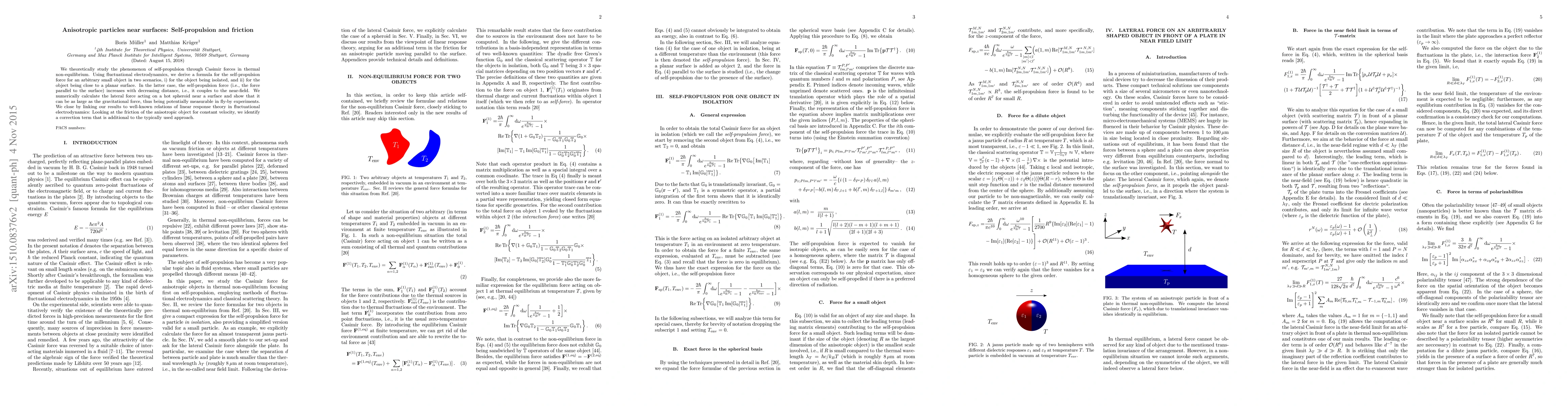 This paper theoretically explores self-propulsion forces in anisotropic particles due to Casimir effects in thermal non-equilibrium, deriving formulas for these forces in both isolated and near-surface scenarios. It finds that the self-propulsion force increases with proximity to a surface and can rival gravitational forces, with implications for measurable fly-by experiments, and introduces a correction term for friction in linear response theory.