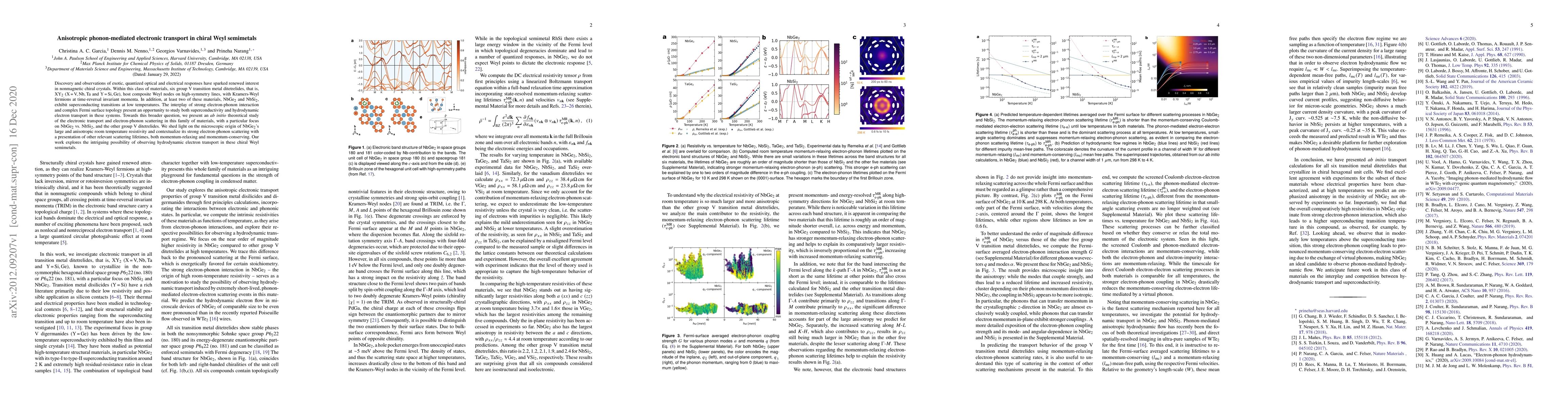 This research investigates anisotropic phonon-mediated electronic transport in chiral Weyl semimetals, focusing on group V ditetrelides, and particularly NbGe$_2$ and NbSi$_2$. It highlights the strong electron-phonon interaction and Fermi surface complexity that could lead to unique superconducting and hydrodynamic electron transport phenomena.