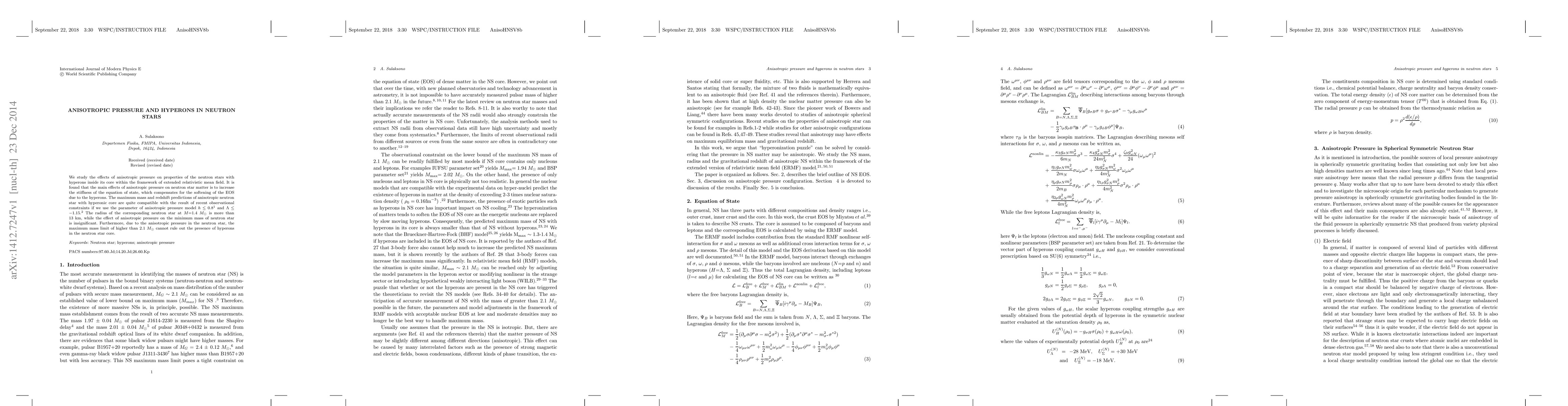 This paper investigates the impact of anisotropic pressure on neutron stars containing hyperons, finding that it increases the equation of state's stiffness, countering hyperon-induced softening. The study concludes that with specific anisotropic pressure parameters, neutron stars can have masses up to 2.1 $M_\odot$ and radii over 13 km, aligning with recent observational data.