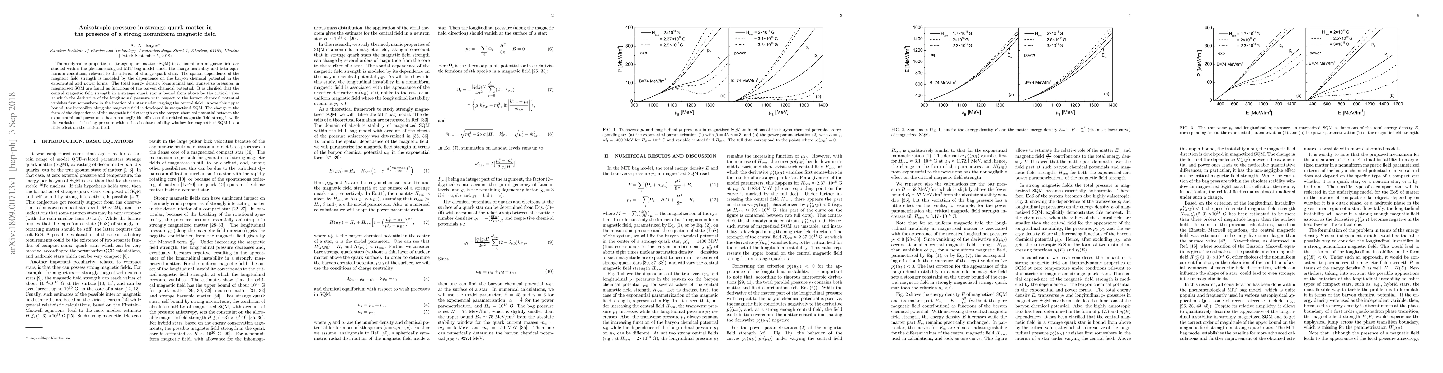 This paper investigates the thermodynamic properties of strange quark matter in nonuniform magnetic fields using the MIT bag model, finding anisotropic pressures and a critical upper bound for central magnetic field strength, which influences stability in strange quark stars. The study highlights the significant impact of the magnetic field strength's form on the critical magnetic field strength.
