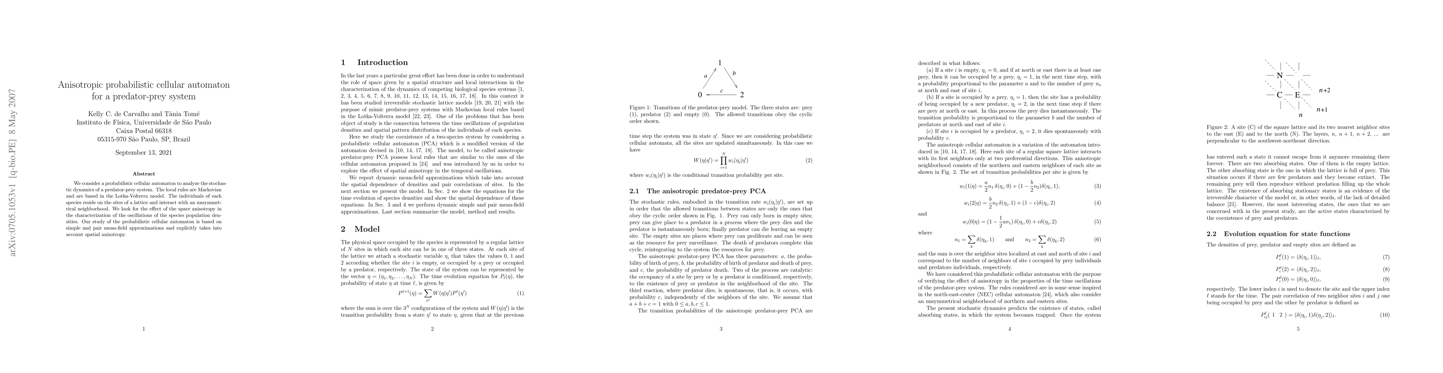 This paper investigates a probabilistic cellular automaton based on the Lotka-Volterra model to study the stochastic dynamics of predator-prey interactions. It examines how spatial anisotropy affects the population oscillations of both species, employing simple and pair mean-field approximations to account for the unsymmetrical neighborhood interactions.