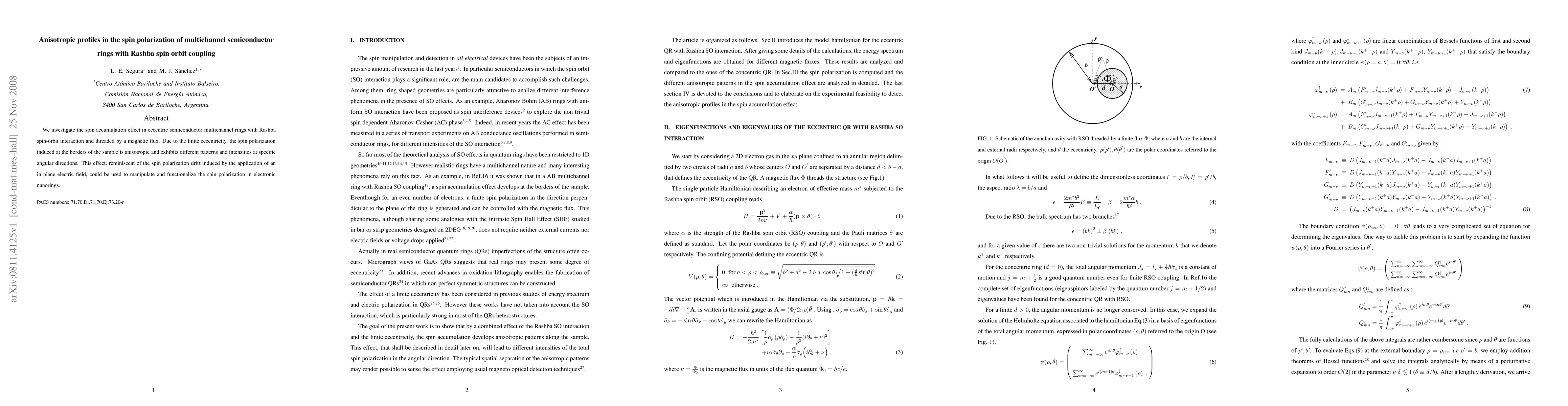 We investigate the spin accumulation effect in eccentric semiconductor multichannel rings with Rashba spin-orbit interaction and threaded by a magnetic flux. Due to the finite eccentricity, the spin polarization induced at the borders of the sample is anisotropic and exhibits different patterns and intensities at specific angular directions. This effect, reminiscent of the spin polarization drift induced by the application of an in plane electric field, could be used to manipulate and functionalize the spin polarization in electronic nanorings.