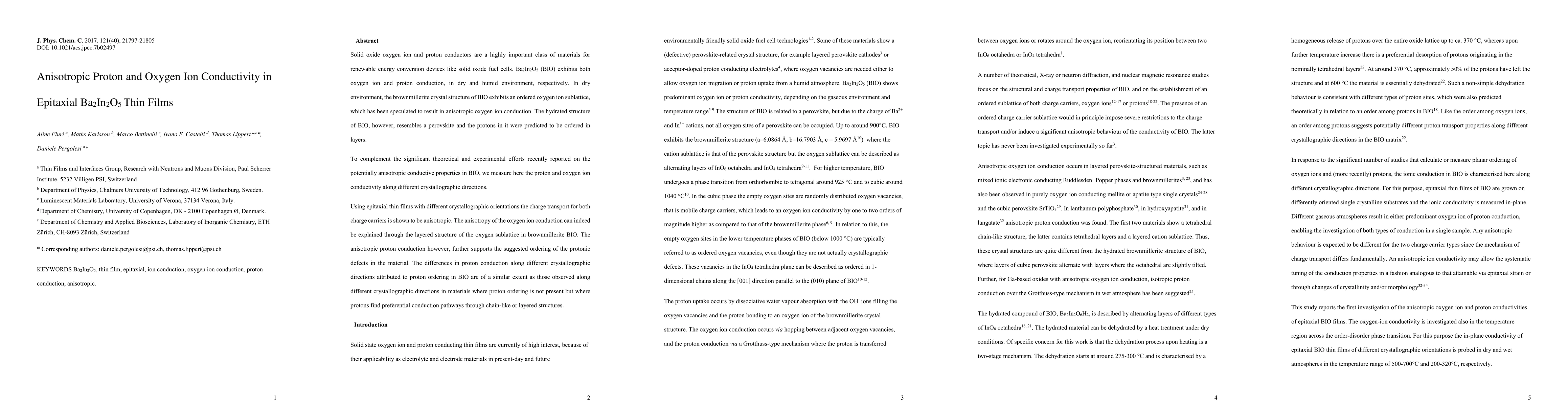 This paper investigates the anisotropic proton and oxygen ion conductivities in epitaxial Ba2In2O5 thin films, revealing that both charge carriers exhibit anisotropic transport along different crystallographic directions. The oxygen ion conduction anisotropy is explained by the layered oxygen sublattice structure, while proton conduction anisotropy supports the hypothesis of proton ordering in the material.
