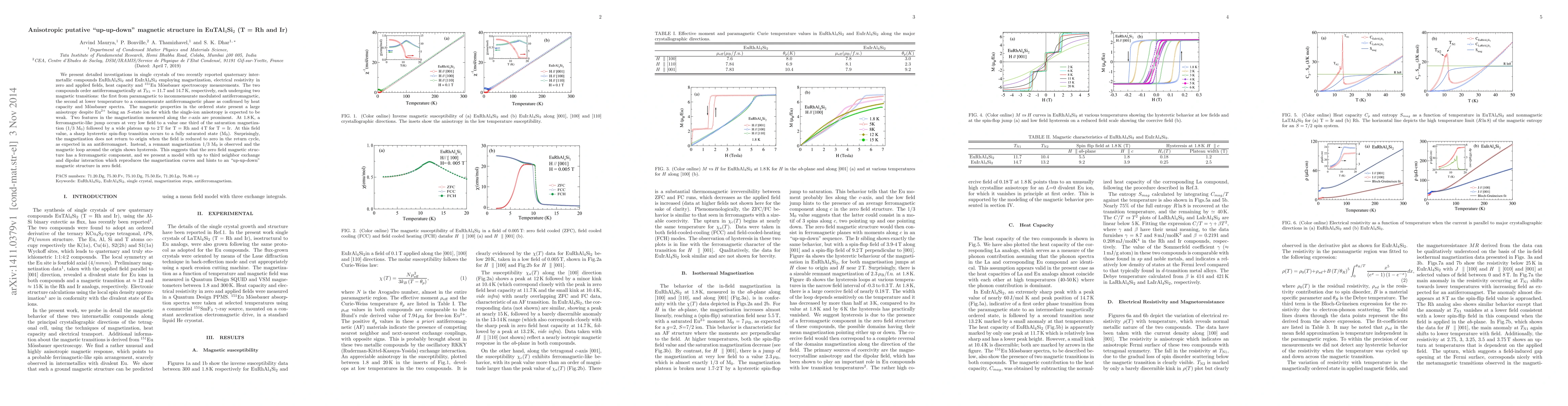 The research investigates EuRhAl$_4$Si$_2$ and EuIrAl$_4$Si$_2$, finding they order antiferromagnetically with two transitions to incommensurate and commensurate phases. Surprisingly, these S-state ions display large magnetic anisotropy, with a ferromagnetic-like jump to 1/3 saturation magnetization, followed by hysteretic spin-flop transitions. A remnant magnetization and loop hysteresis suggest a zero-field ferromagnetic component, proposed as an 'up-up-down' structure via third-neighbor exchange and dipolar interaction models.