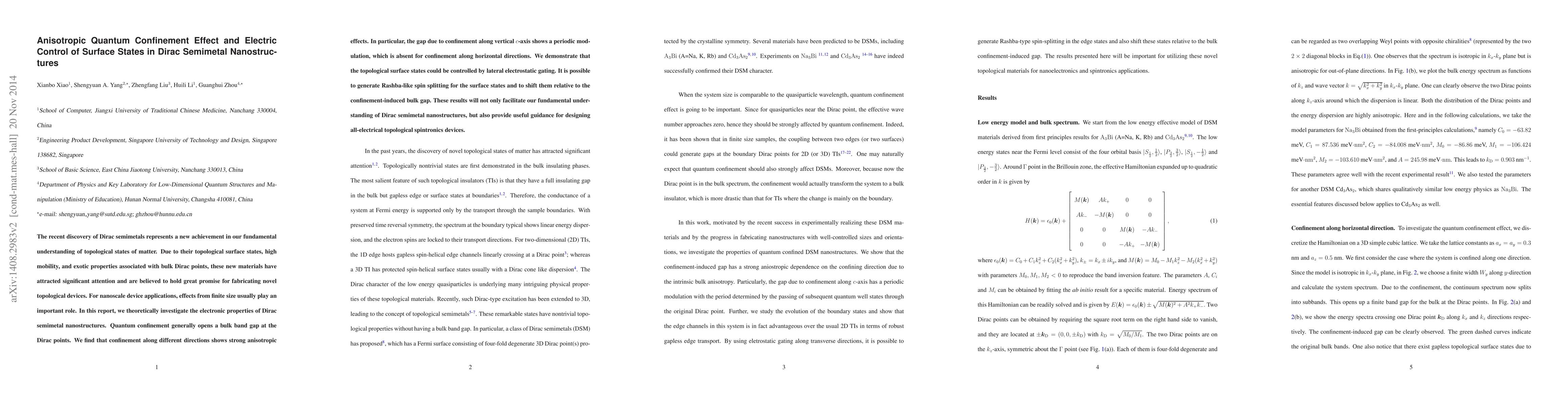 This paper investigates the anisotropic quantum confinement effects in Dirac semimetal nanostructures, revealing a periodic modulation in the bulk band gap along the vertical c-axis. The study also demonstrates the electric control of topological surface states via lateral electrostatic gating, paving the way for the development of all-electrical topological spintronics devices.