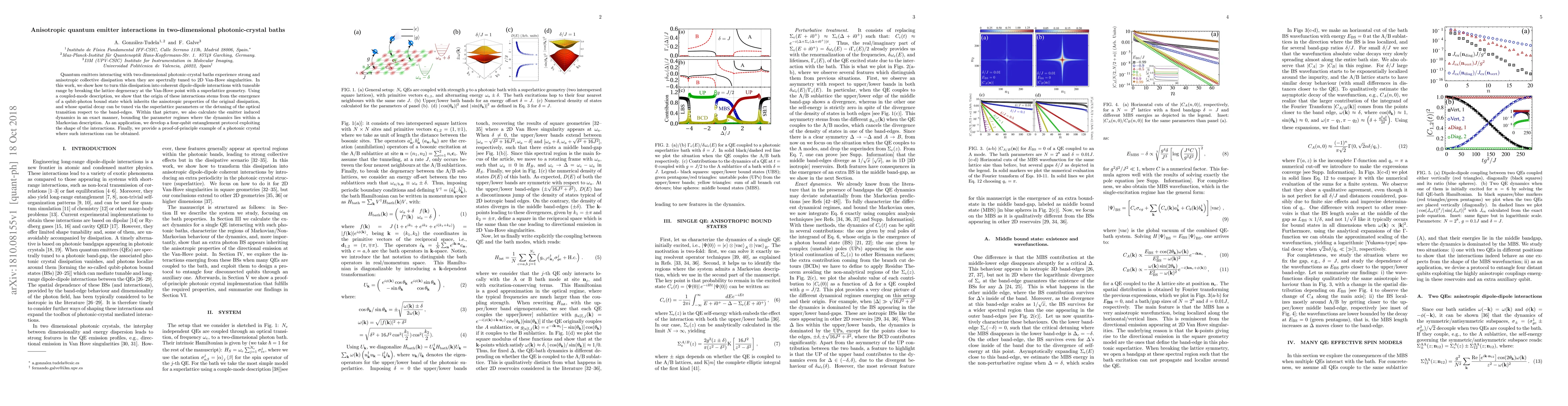 This paper explores anisotropic quantum emitter interactions in two-dimensional photonic-crystal baths, demonstrating how to convert strong collective dissipation into tunable dipole-dipole interactions using a superlattice geometry. The study develops a four-qubit entanglement protocol based on the coherent interactions and provides a proof-of-principle example of a photonic crystal exhibiting these effects.