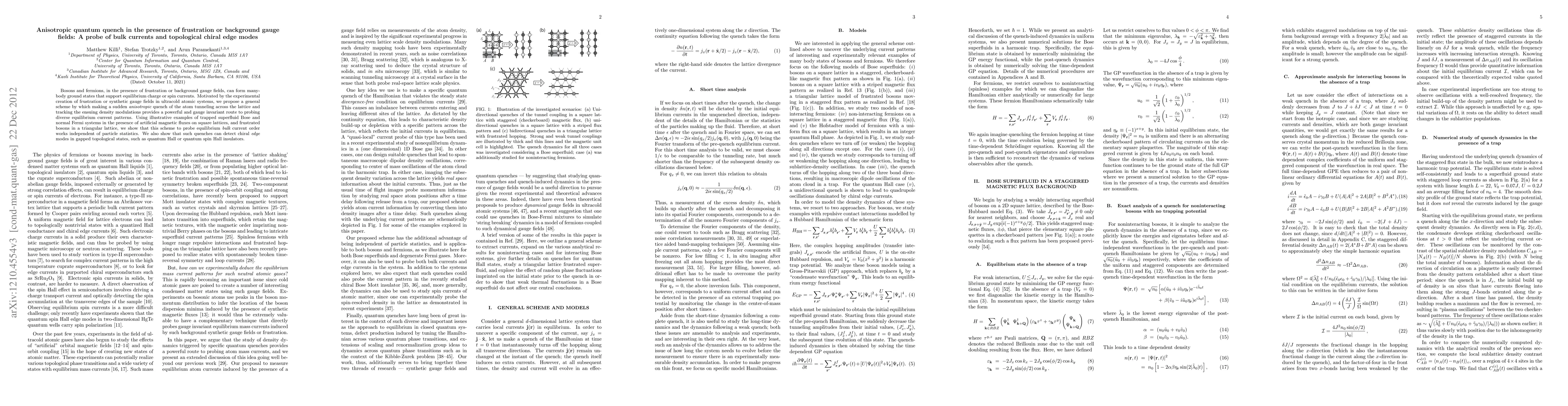 Bosons and fermions, in the presence of frustration or background gauge fields, can form manybody ground states that support equilibrium 'charge' or 'spin' currents. Motivated by the experimental creation of frustration or artificial gauge fields in ultracold atomic systems, we propose a general scheme by which making a sudden anisotropic quench of the atom tunneling across the lattice and tracking the ensuing density modulations provides a powerful and gauge invariant route to visualizing diverse equilibrium current patterns. Using illustrative examples of trapped superfluid Bose and normal Fermi systems in the presence of artificial magnetic fluxes on square lattices, and frustrated bosons in a triangular lattice, we show that this scheme to probe equilibrium bulk current order works independent of particle statistics. We also show that such quenches can detect chiral edge currents in gapped topological states, such as quantum Hall or quantum spin Hall insulators.