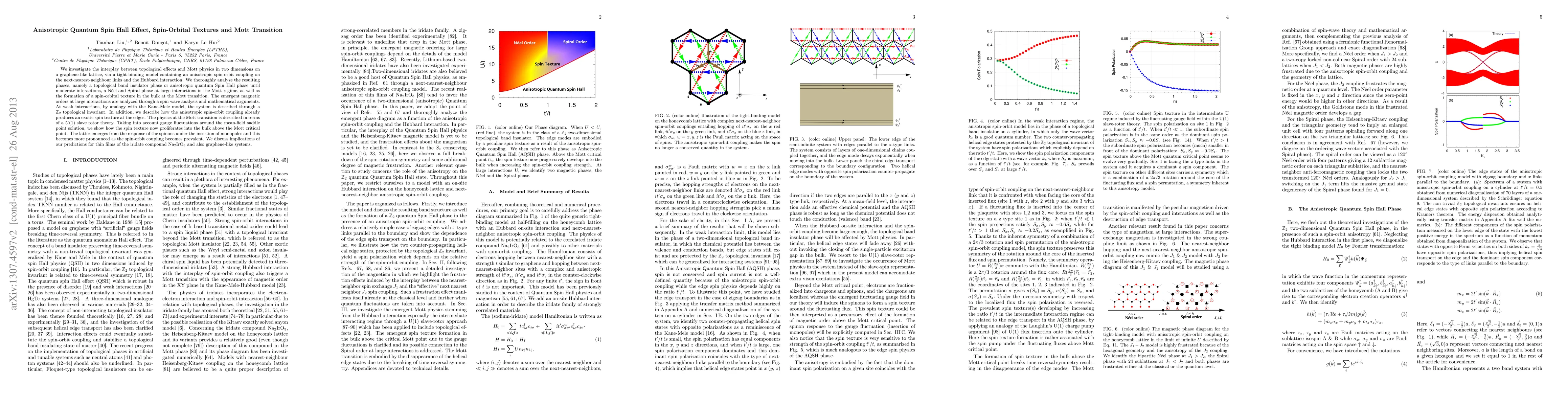 We investigate the interplay between topological effects and Mott physics in two dimensions on a graphene-like lattice, via a tight-binding model containing an anisotropic spin-orbit coupling on the next-nearest-neighbour links and the Hubbard interaction. We thoroughly analyze the resulting phases, namely a topological band insulator phase or anisotropic quantum Spin Hall phase until moderate interactions, a N\'eel and Spiral phase at large interactions in the Mott regime, as well as the formation of a spin-orbital texture in the bulk at the Mott transition. The emergent magnetic orders at large interactions are analyzed through a spin wave analysis and mathematical arguments. At weak interactions, by analogy with the Kane-Mele model, the system is described through a Z_2 topological invariant. In addition, we describe how the anisotropic spin-orbit coupling already produces an exotic spin texture at the edges. The physics at the Mott transition is described in terms of a U(1) slave rotor theory. Taking into account gauge fluctuations around the mean-field saddle point solution, we show how the spin texture now proliferates into the bulk above the Mott critical point. The latter emerges from the response of the spinons under the insertion of monopoles and this becomes more pronounced as the spin-orbit coupling becomes prevalent. We discuss implications of our predictions for thin films of the iridate compound Na2IrO3 and also graphene-like systems.