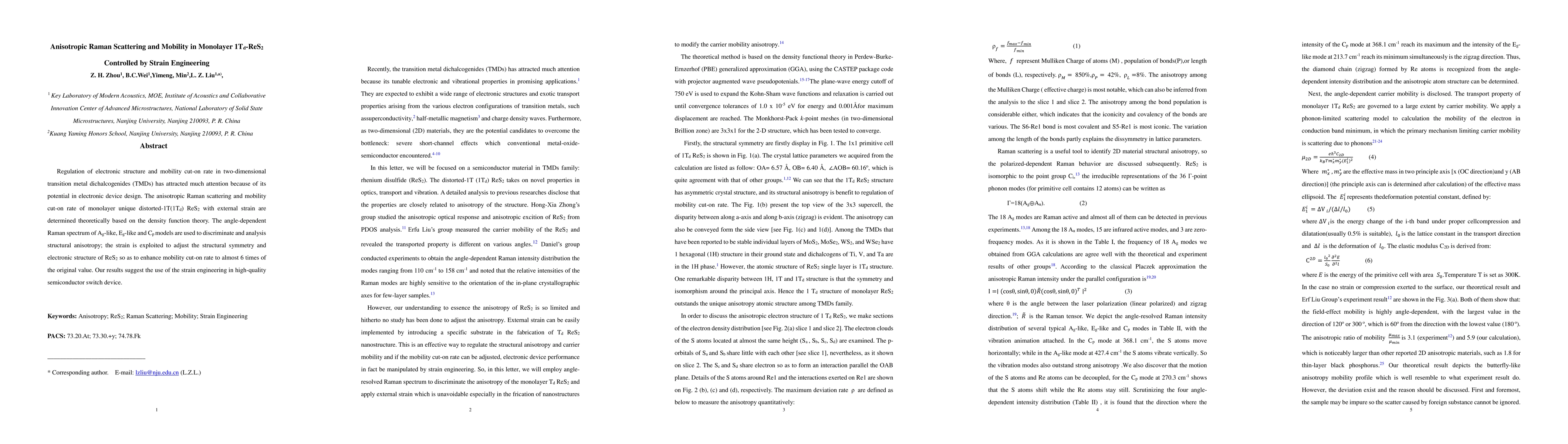 This paper investigates how strain engineering can manipulate the anisotropic Raman scattering and mobility in monolayer 1Td-ReS2. Theoretical analysis using density function theory reveals that strain can enhance the mobility cut-on rate by nearly six times, suggesting its potential for high-quality semiconductor switch devices.
