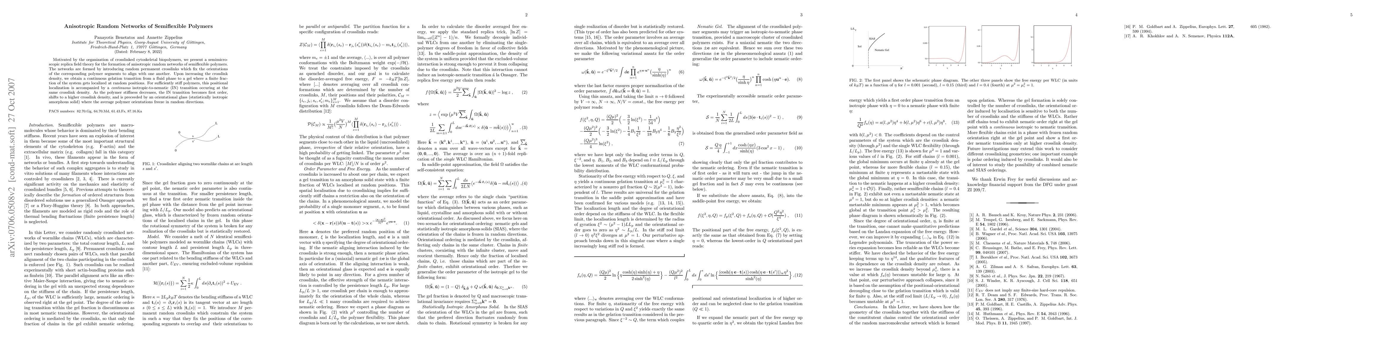 The research presents a semimicroscopic replica field theory for anisotropic random networks of semiflexible polymers, modeling crosslinks as quenched disorder and calculating the disorder-averaged free energy using the saddle-point approximation.