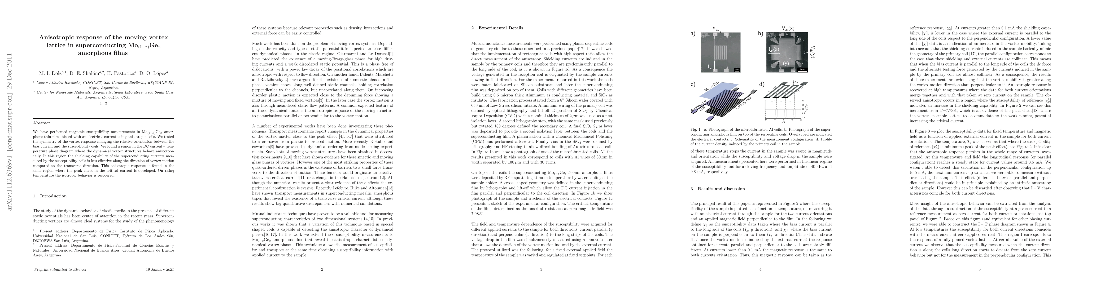 We have performed magnetic susceptibility measurements in Mo$_{(1-x)}$Ge$_x$ amorphous thin films biased with an electrical current using anisotropic coils. We tested the symmetry of the vortex response changing the relative orientation between the bias current and the susceptibility coils. We found a region in the DC current - temperature phase diagram where the dynamical vortex structures behave anisotropically. In this region the shielding capability of the superconducting currents measured by the susceptibility coils is less effective along the direction of vortex motion compared to the transverse direction. This anisotropic response is found in the same region where the peak effect in the critical current is developed. On rising temperature the isotropic behavior is recovered.