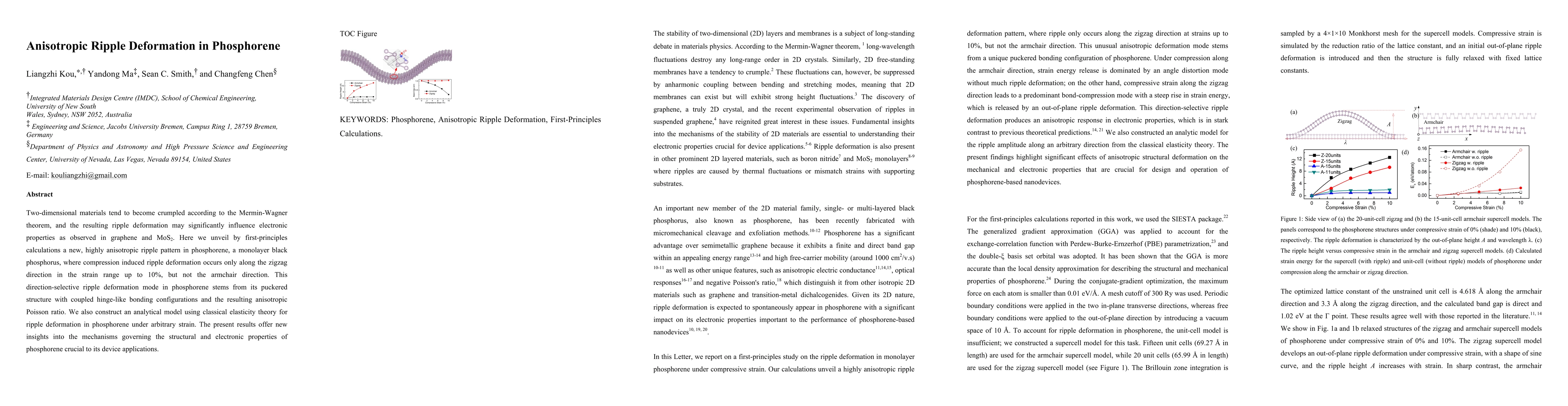 This study reveals anisotropic ripple deformation in phosphorene under compression, showing deformation only along the zigzag direction, due to its unique puckered structure and anisotropic Poisson ratio. An analytical model based on classical elasticity theory is developed to predict ripple deformation, providing insights into phosphorene's structural and electronic properties for device applications.
