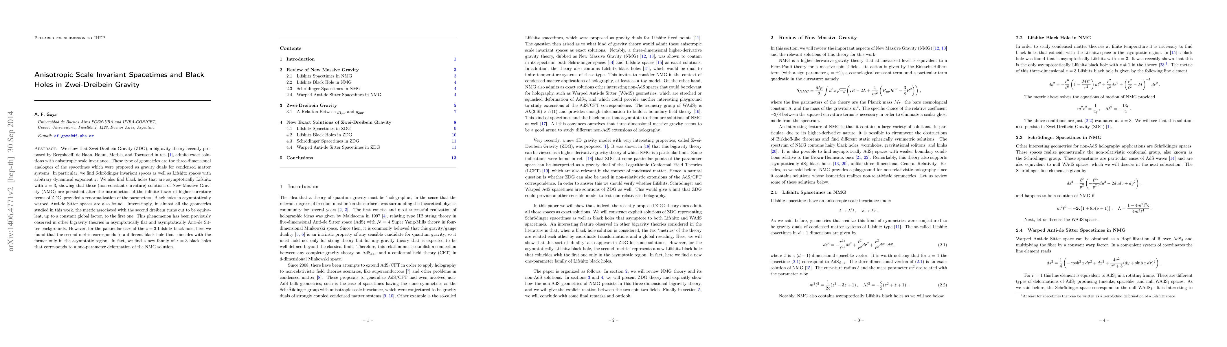 Zwei-Dreibein Gravity theory admits exact solutions with anisotropic scale invariance, including Schrödinger invariant spaces, Lifshitz spaces with arbitrary dynamical exponent z, and black holes that are asymptotically Lifshitz with z = 3.