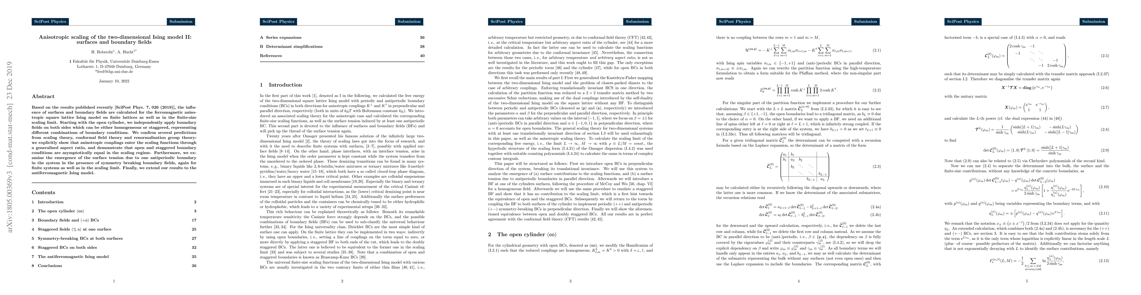 Based on the results published recently [SciPost Phys. 7, 026 (2019)], the influence of surfaces and boundary fields are calculated for the ferromagnetic anisotropic square lattice Ising model on finite lattices as well as in the finite-size scaling limit. Starting with the open cylinder, we independently apply boundary fields on both sides which can be either homogeneous or staggered, representing different combinations of boundary conditions. We confirm several predictions from scaling theory, conformal field theory and renormalisation group theory: we explicitly show that anisotropic couplings enter the scaling functions through a generalised aspect ratio, and demonstrate that open and staggered boundary conditions are asymptotically equal in the scaling regime. Furthermore, we examine the emergence of the surface tension due to one antiperiodic boundary in the system in the presence of symmetry breaking boundary fields, again for finite systems as well as in the scaling limit. Finally, we extend our results to the antiferromagnetic Ising model.