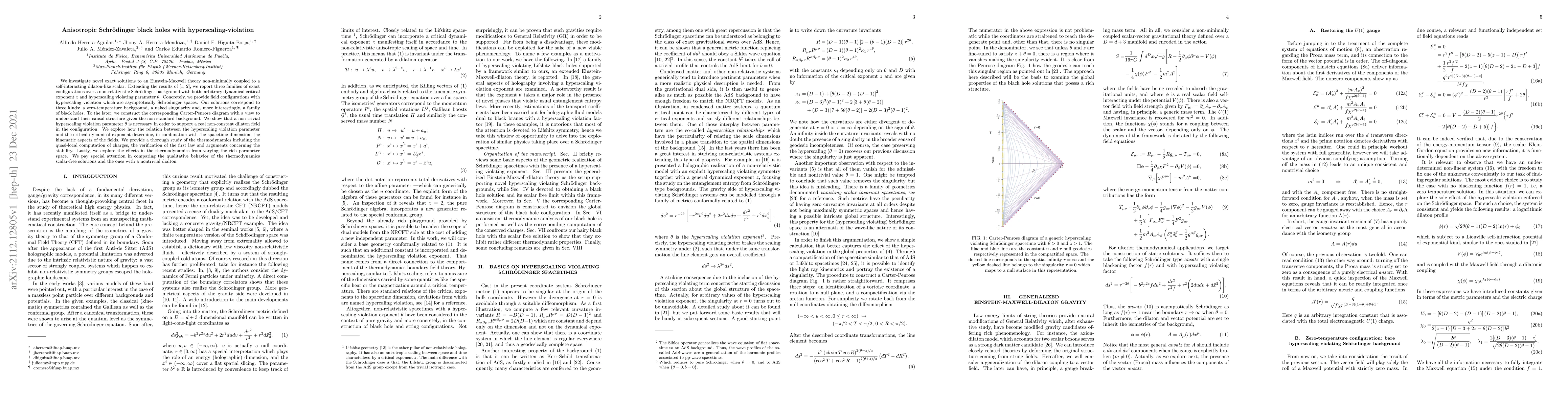 This paper explores novel exact solutions to an Einstein-Maxwell theory with a non-relativistic Schrödinger background, focusing on anisotropic black holes with hyperscaling violation. It identifies three types of configurations: zero-temperature, naked singularities, and black holes, and examines their causal structure, thermodynamics, and the effects of varying parameters.
