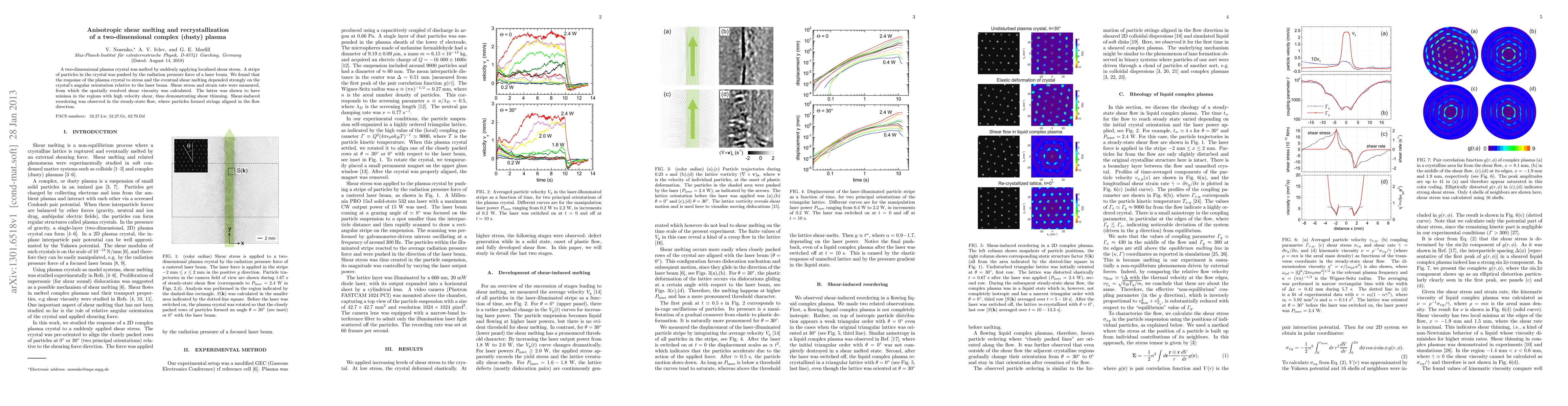 A two-dimensional plasma crystal was melted by suddenly applying localized shear stress. A stripe of particles in the crystal was pushed by the radiation pressure force of a laser beam. We found that the response of the plasma crystal to stress and the eventual shear melting depended strongly on the crystal's angular orientation relative to the laser beam. Shear stress and strain rate were measured, from which the spatially resolved shear viscosity was calculated. The latter was shown to have minima in the regions with high velocity shear, thus demonstrating shear thinning. Shear-induced reordering was observed in the steady-state flow, where particles formed strings aligned in the flow direction.