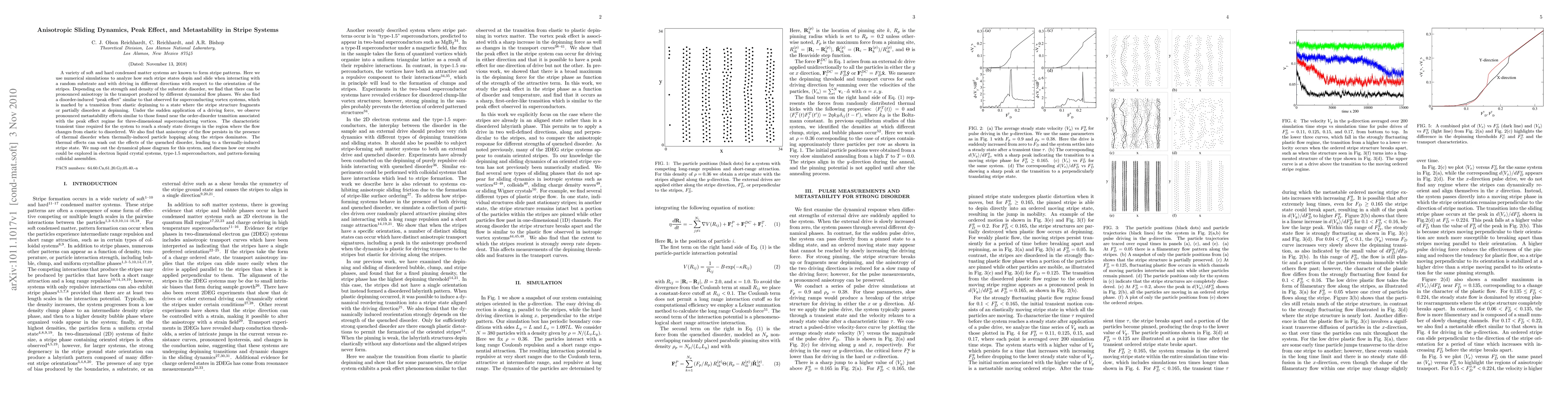 This paper uses numerical simulations to explore the anisotropic sliding dynamics of stripe patterns in disordered systems, revealing a "peak effect" and metastability phenomena. The study maps out a dynamical phase diagram and discusses the implications for electron liquid crystals, type-1.5 superconductors, and colloidal assemblies.