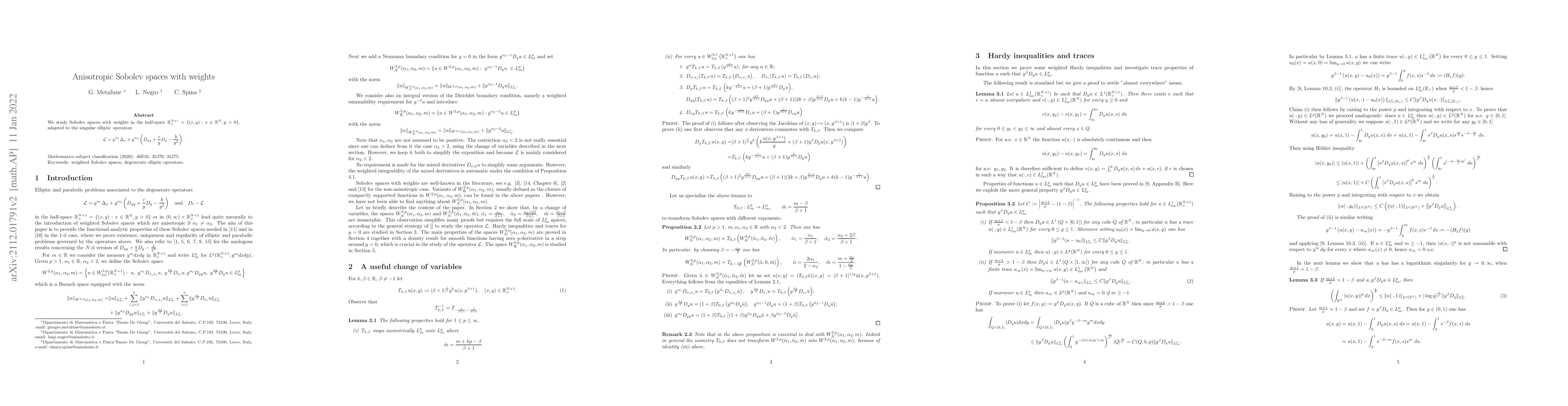 We study Sobolev spaces with weights in the half-space $\mathbb{R}^{N+1}_+=\{(x,y): x \in \mathbb{R}^N, y>0\}$, adapted to the singular elliptic operators \begin{equation*} \mathcal L =y^{\alpha_1}\Delta_{x} +y^{\alpha_2}\left(D_{yy}+\frac{c}{y}D_y -\frac{b}{y^2}\right). \end{equation*}