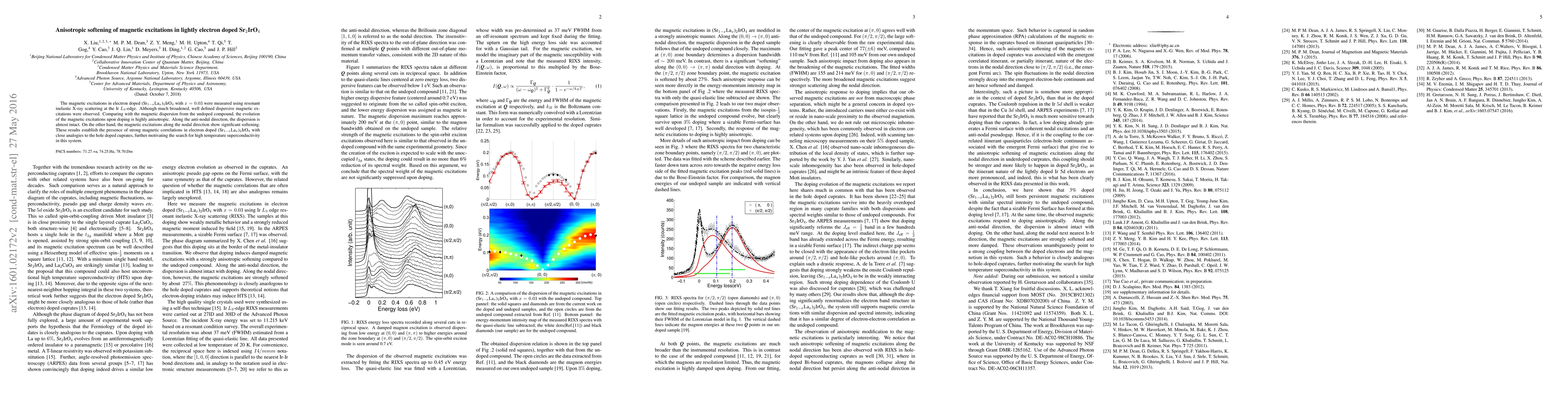 The study reveals anisotropic softening of magnetic excitations in lightly electron doped Sr$_2$IrO$_4$, with minimal changes along the anti-nodal direction and significant softening along the nodal direction, indicating strong magnetic correlations akin to those in hole doped cuprates.