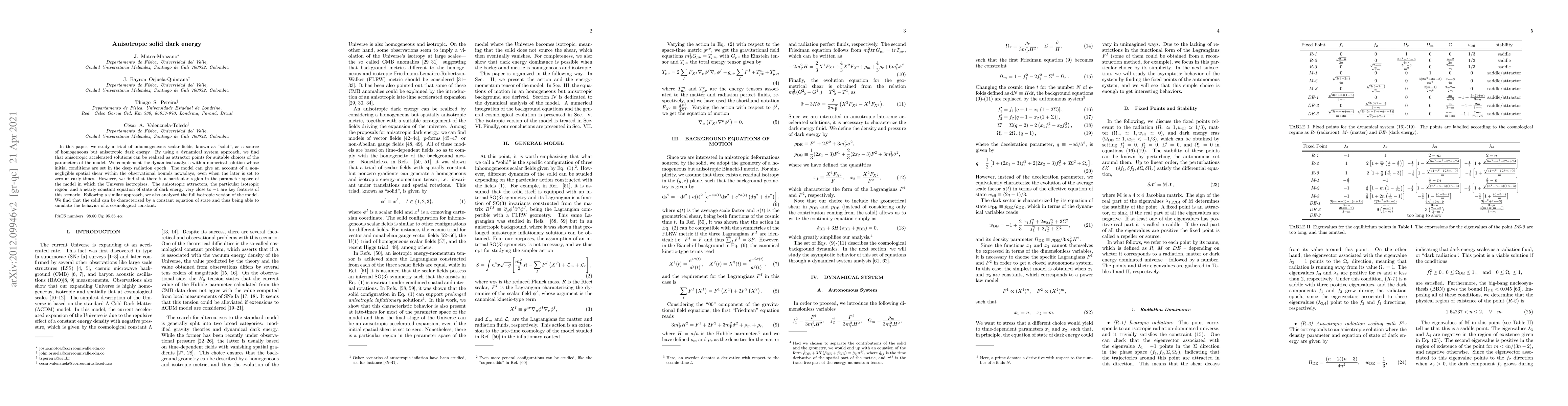In this paper, we study a triad of inhomogeneous scalar fields, known as "solid", as a source of homogeneous but anisotropic dark energy. By using a dynamical system approach, we find that anisotropic accelerated solutions can be realized as attractor points for suitable choices of the parameters of the model. We complement the dynamical analysis with a numerical solution whose initial conditions are set in the deep radiation epoch. The model can give an account of a non-negligible spatial shear within the observational bounds nowadays, even when the later is set to zero at early times. However, we find that there is a particular region in the parameter space of the model in which the Universe isotropizes. The anisotropic attractors, the particular isotropic region, and a nearly constant equation of state of dark energy very close to $- 1$ are key features of this scenario. Following a similar approach, we also analyzed the full isotropic version of the model. We find that the solid can be characterized by a constant equation of state and thus being able to simulate the behavior of a cosmological constant.