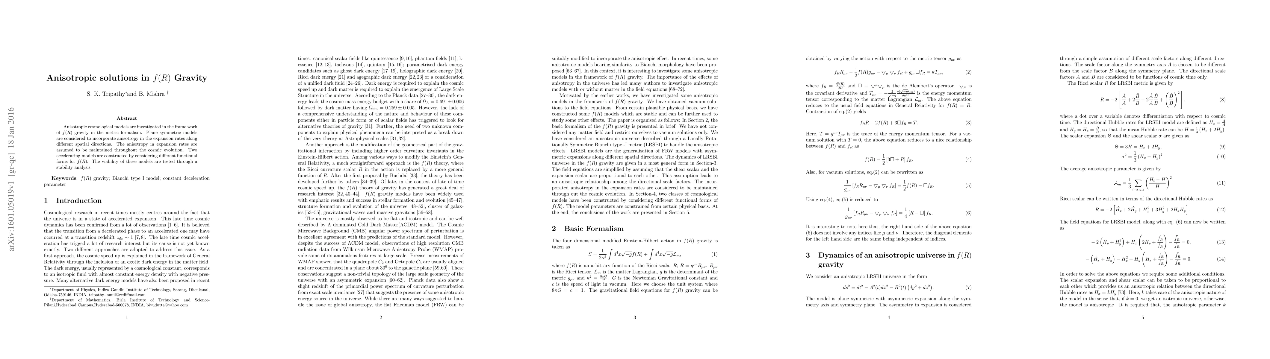 Anisotropic cosmological models are investigated in the frame work of $f(R)$ gravity in the metric formalism. Plane symmetric models are considered to incorporate anisotropy in the expansion rates along different spatial directions. The anisotropy in expansion rates are assumed to be maintained throughout the cosmic evolution. Two accelerating models are constructed by considering different functional forms for f(R). The viability of these models are tested through a stability analysis.