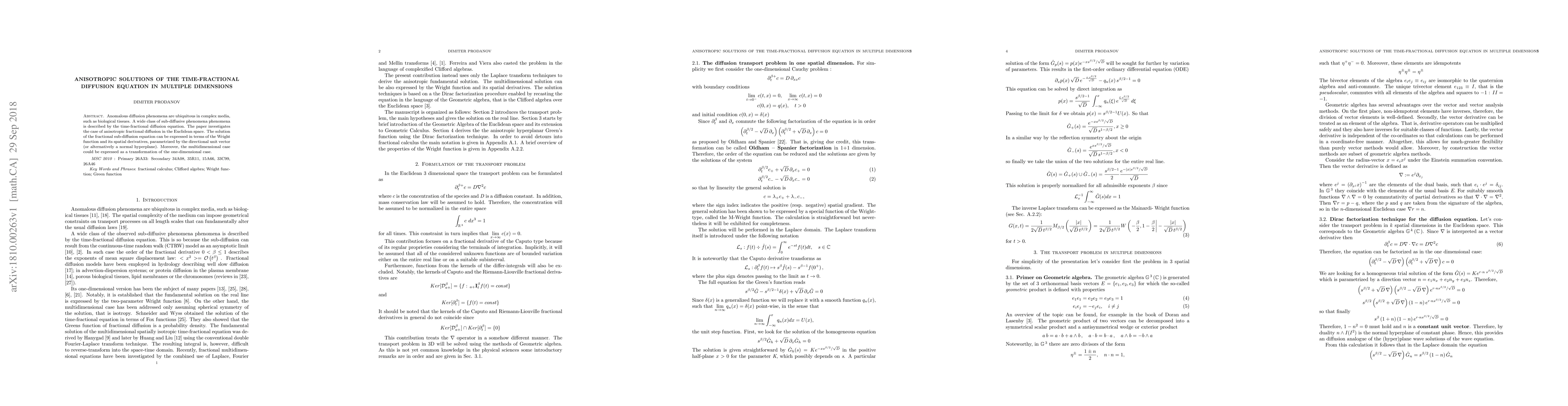 Anomalous diffusion phenomena are ubiquitous in complex media, such as biological tissues. A wide class of sub-diffusive phenomena phenomena is described by the time-fractional diffusion equation. The paper investigates the case of anisotropic fractional diffusion in the Euclidean space. The solution of the fractional sub-diffusion equation can be expressed in terms of the Wright function and its spatial derivatives, parametrized by the directional unit vector (or alternatively a normal hyperplane). Moreover, the multidimensional case could be expressed as a transformation of the one-dimensional case.