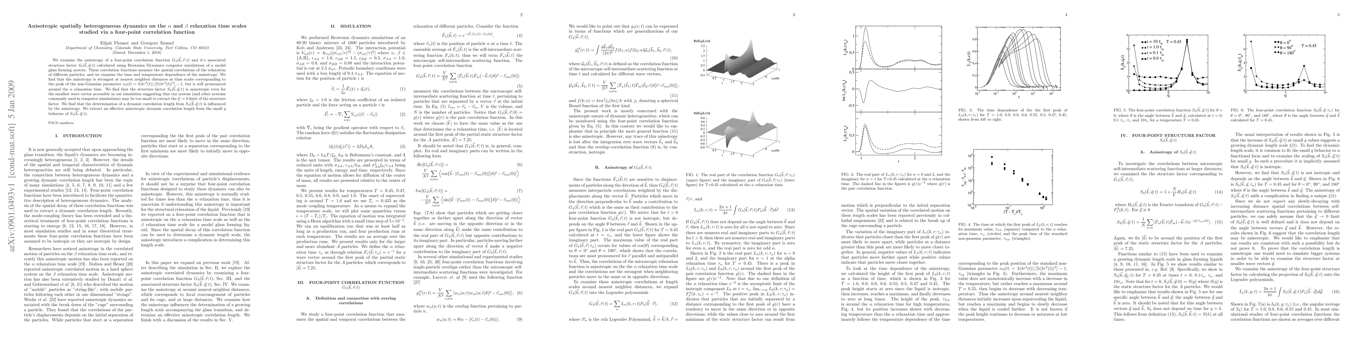 We examine the anisotropy of a four-point correlation function $G_4(\vec{k},\vec{r};t)$ and it's associated structure factor $S_4(\vec{k},\vec{q};t)$ calculated using Brownian Dynamics computer simulations of a model glass forming system. These correlation functions measure the spatial correlations of the relaxation of different particles, and we examine the time and temperature dependence of the anisotropy. We find that the anisotropy is strongest at nearest neighbor distances at time scales corresponding to the peak of the non-Gaussian parameter $\alpha_2(t) = 3 < \delta r^4(t) >/[ 5 < \delta r^2(t) >^2] - 1$, but is still pronounced around the $\alpha$ relaxation time. We find that the structure factor $S_4(\vec{k},\vec{q};t)$ is anisotropic even for the smallest wave vector accessible in our simulation suggesting that our system (and other systems commonly used in computer simulations) may be too small to extract the $\vec{q} \to 0$ limit of the structure factor. We find that the determination of a dynamic correlation length from $S_4(\vec{k},\vec{q};t)$ is influenced by the anisotropy. We extract an effective anisotropic dynamic correlation length from the small $q$ behavior of $S_4(\vec{k},\vec{q};t)$.