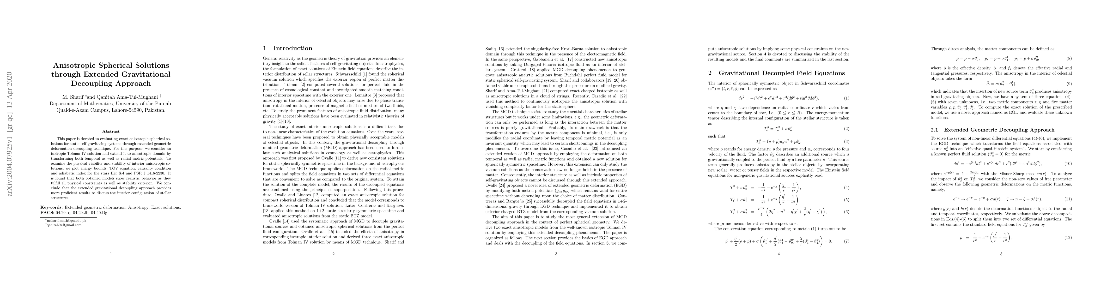 This paper evaluates anisotropic spherical solutions for static self-gravitating systems using an extended gravitational decoupling approach, transforming the isotropic Tolman IV solution. The models for stars Her X-I and PSR J 1416-2230 meet physical constraints and stability criteria, demonstrating the effectiveness of the method.